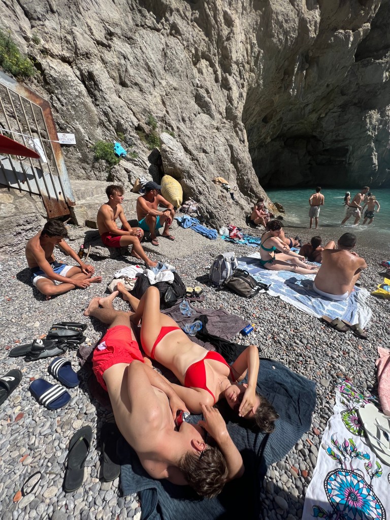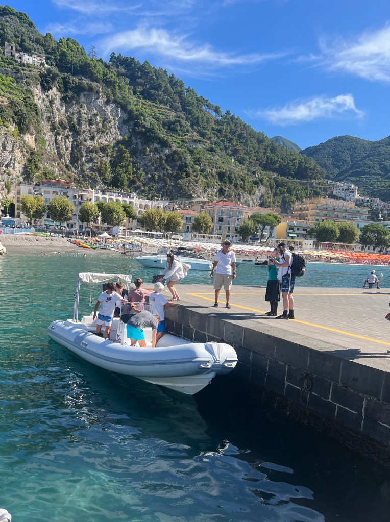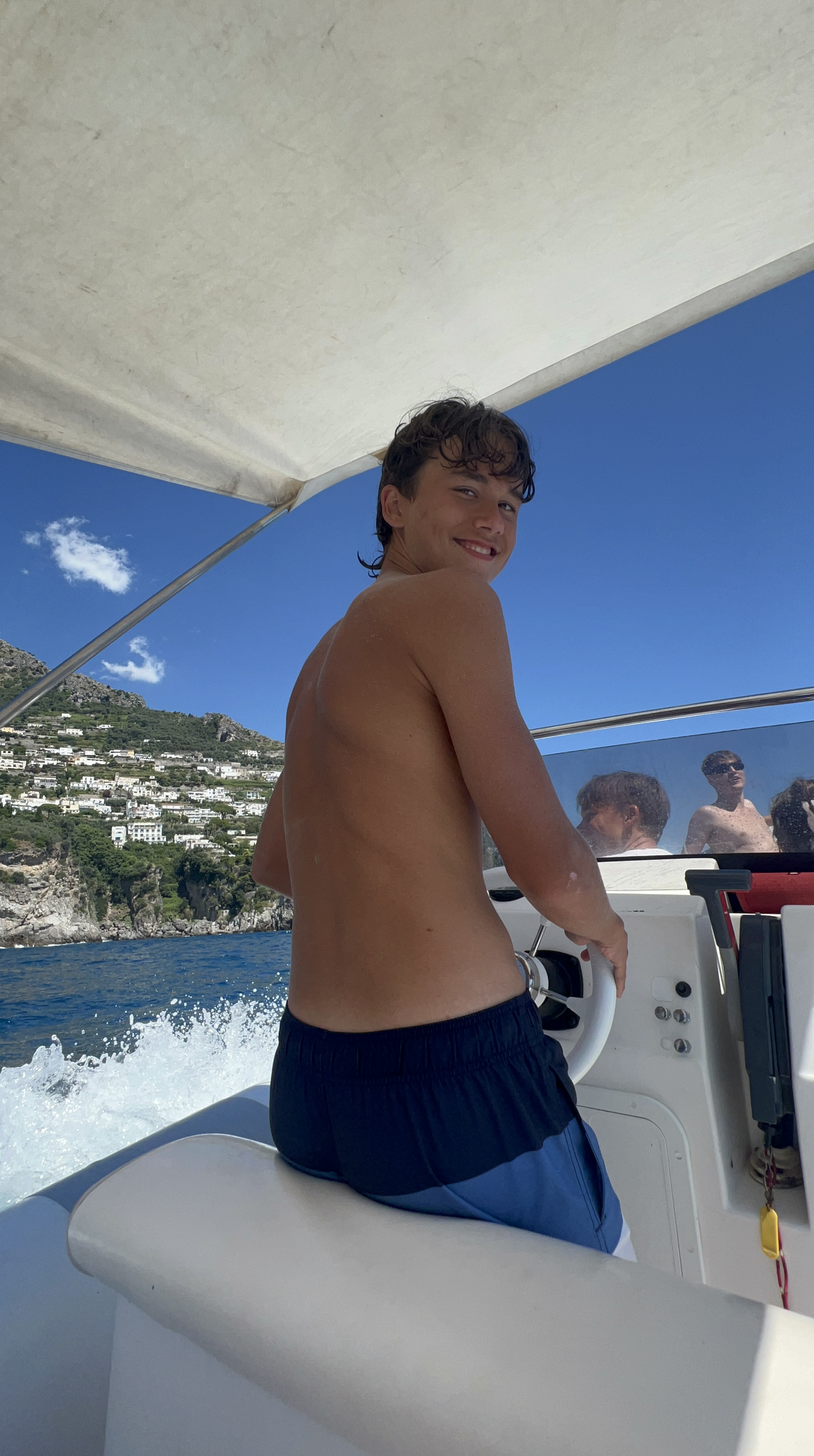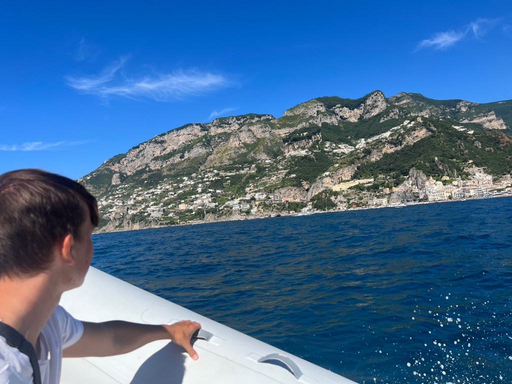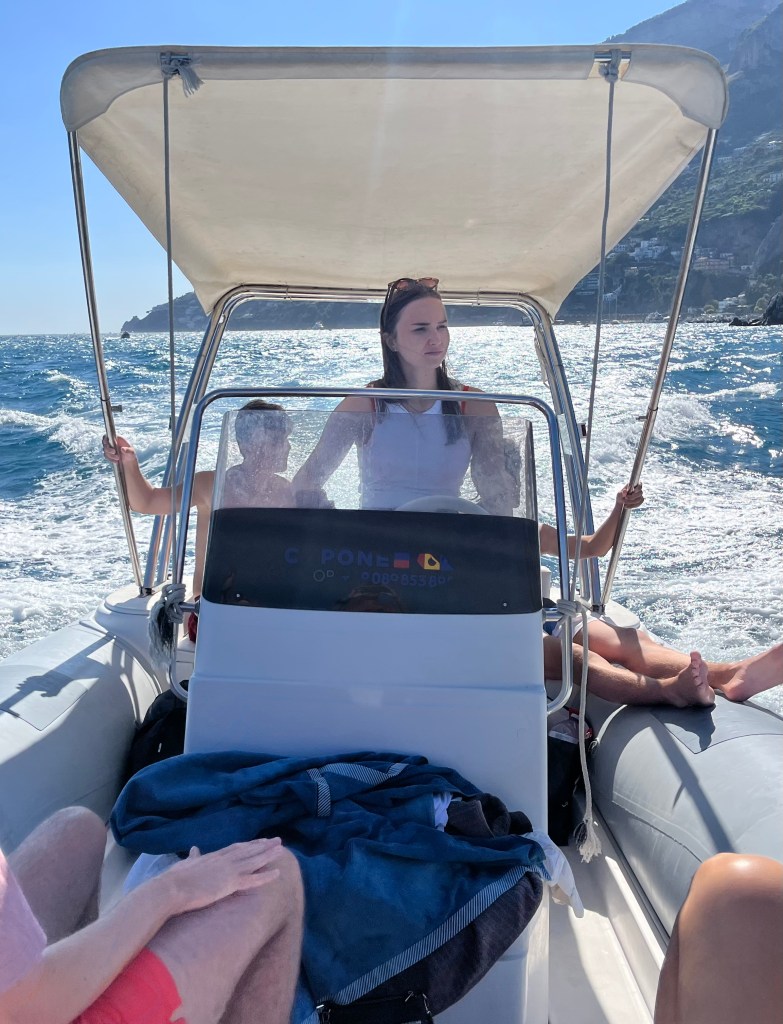 When Jesse went to swim back to the boat with Lennon, the boat was gone! He had anchored it, but they couldn’t find it anywhere. He walked up to a man on the beach and told him our boat was gone. The guy didn’t speak much English and said that it was not his problem. Jesse talked to him for a bit and asked for help. The guy radioed a co-worker then told Jesse “your boata moveda.” Somehow the boat unmoored itself and traveled closer to shore. Jesse, Lennon and Michael went to get it and Lennon got hit in the head with the anchor as he and Michael were pulling it up. But everyone survived! Jesse navigated the absolute mayhem well. There were tourists upon tourists! Boats coming and going. I have to say these cities are beautiful but the amount of people is outrageous and a scoop of gelato costs a small fortune. Give me an old village with good coffee and friendly people and I could walk around for hours. Anyhoo – all’s well that ends well! We got back in the boat and went searching for more fun stuff to do and see.
