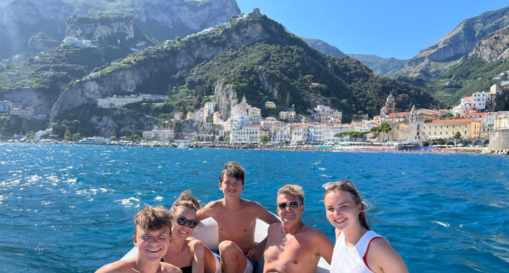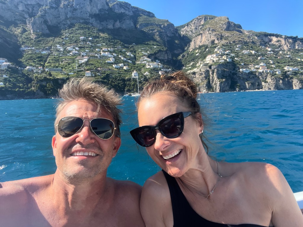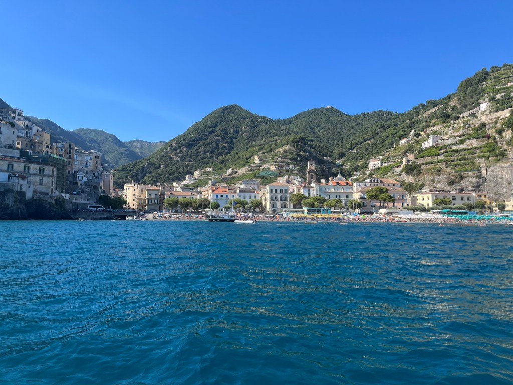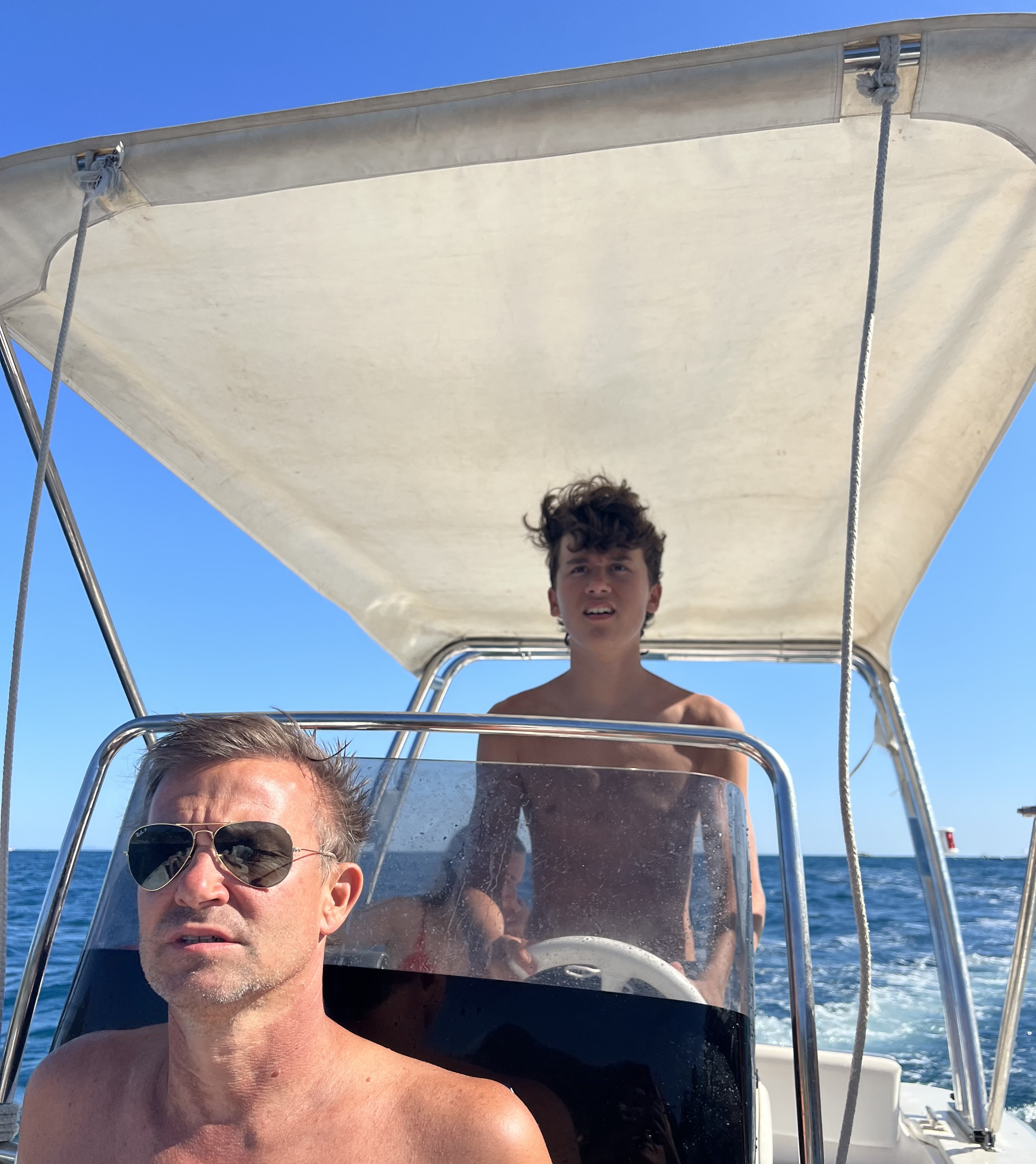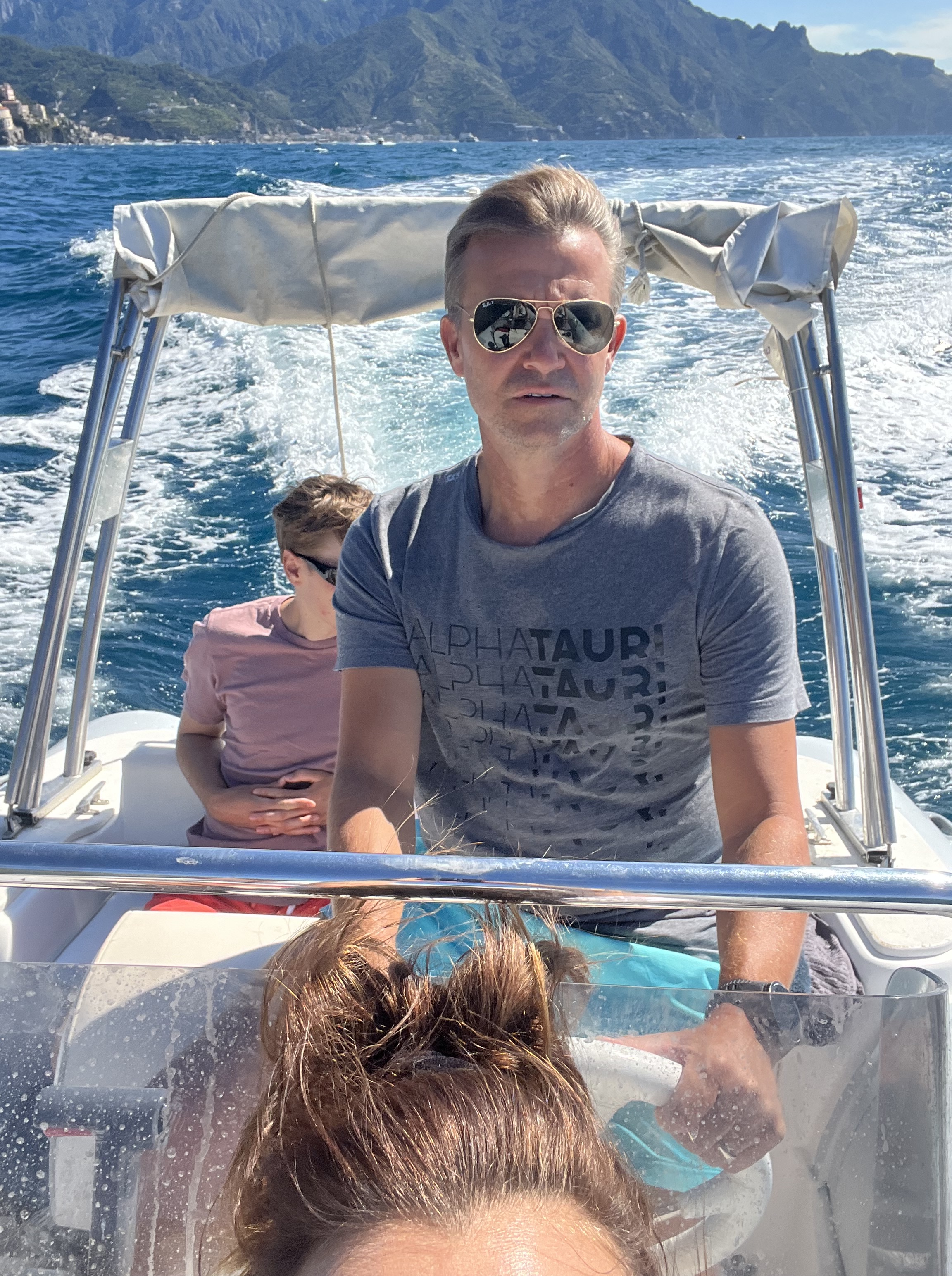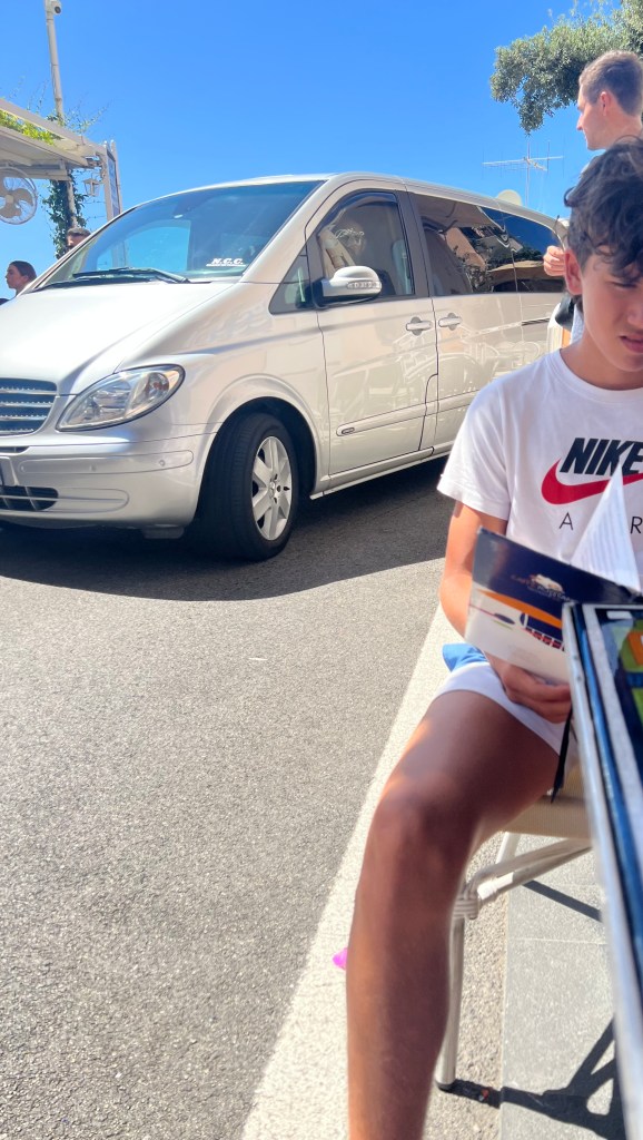 When Jesse went to swim back to the boat with Lennon, the boat was gone! He had anchored it, but they couldn’t find it anywhere. He walked up to a man on the beach and told him our boat was gone. The guy didn’t speak much English and said that it was not his problem. Jesse talked to him for a bit and asked for help. The guy radioed a co-worker then told Jesse “your boata moveda.” Somehow the boat unmoored itself and traveled closer to shore. Jesse, Lennon and Michael went to get it and Lennon got hit in the head with the anchor as he and Michael were pulling it up. But everyone survived! Jesse navigated the absolute mayhem well. There were tourists upon tourists! Boats coming and going. I have to say these cities are beautiful but the amount of people is outrageous and a scoop of gelato costs a small fortune. Give me an old village with good coffee and friendly people and I could walk around for hours. Anyhoo – all’s well that ends well! We got back in the boat and went searching for more fun stuff to do and see.