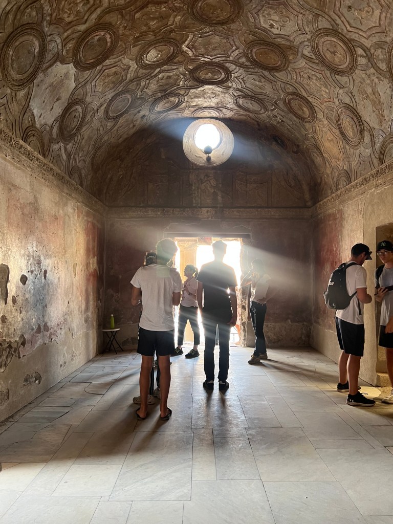 As I was walking, I was thinking to myself that this incredibly detailed, sophisticated Roman city was covered in about 20 feet of ash and volcanic residue after Mount Vesuvius erupted in 79 A.D. I was looking in people’s homes and could somewhat envision what life was like then. You can see paintings on the walls and in front of some homes, you will see the word ‘have’ which means welcome.