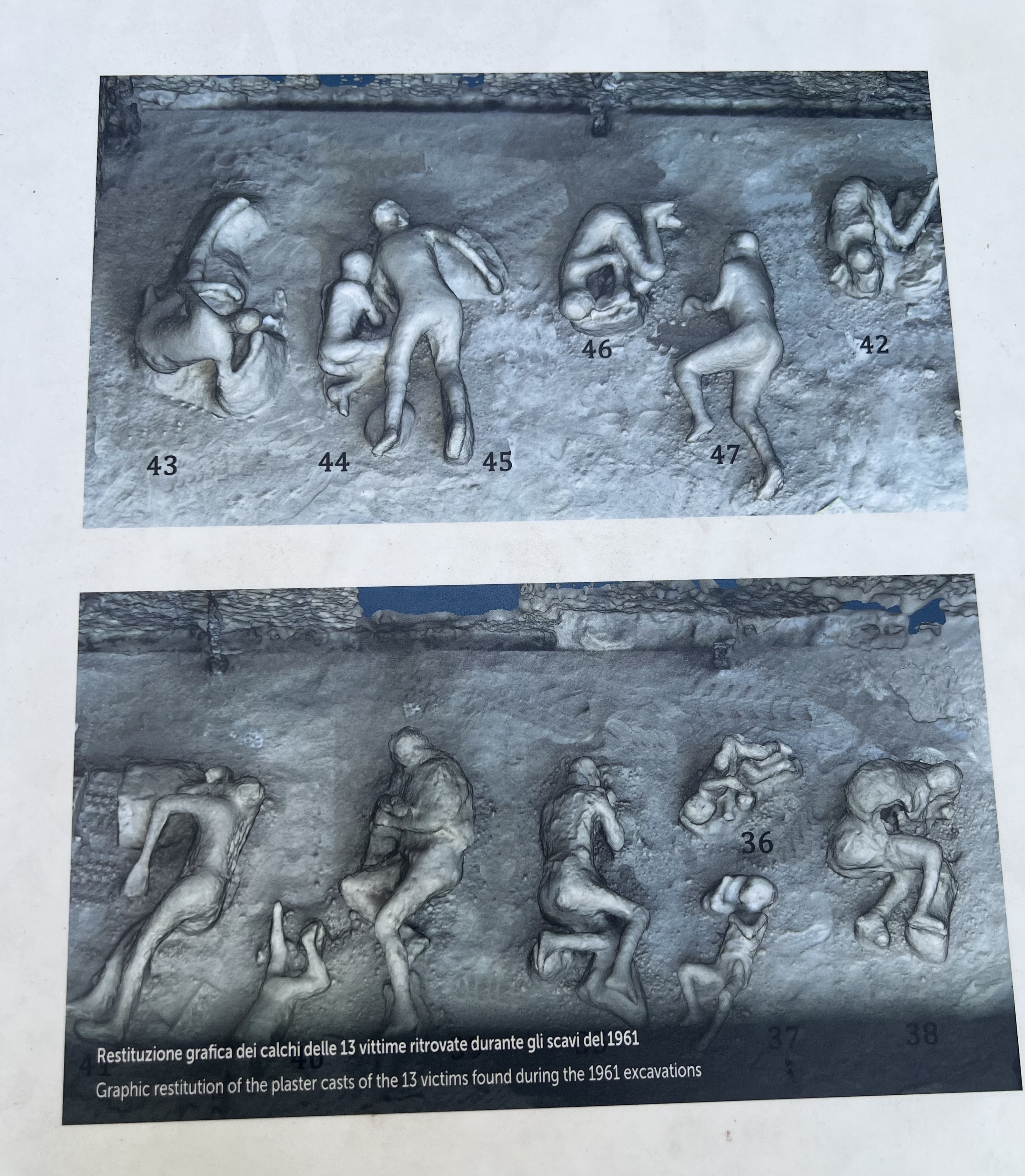 “In this vineyard 13 victims of the eruption were found including adults and children, as well as masters and servants who lost heir lives as they sought salvation whilst running towards Porta Nocera, running over the blanket of pumice which would reach 3.5 meters in depth. It was possible to create the plaster casts due to the unusual nature of the eruption of 79 A.D. for between 18 and 19 hours, a volcanic rain of pumice covered all of the open spaces of the city, the streets, the Forum, the courtyards and the gardens. Then, clouds of ash and gas overwhelmed the city and proved lethal for those who had survived thus far, causing the instantaneous death from thermal shock of anyone still in the city. The bodies of these victims remained in the positions in which they had been struck by the pyroclastic flow, and the solidified ash preserved their imprint. Pouring a mixture of gypsum and water into the voids, caused by the decomposition of organic substances, is possible to preserve the body, shape and position of the object or body that had been buried within.”