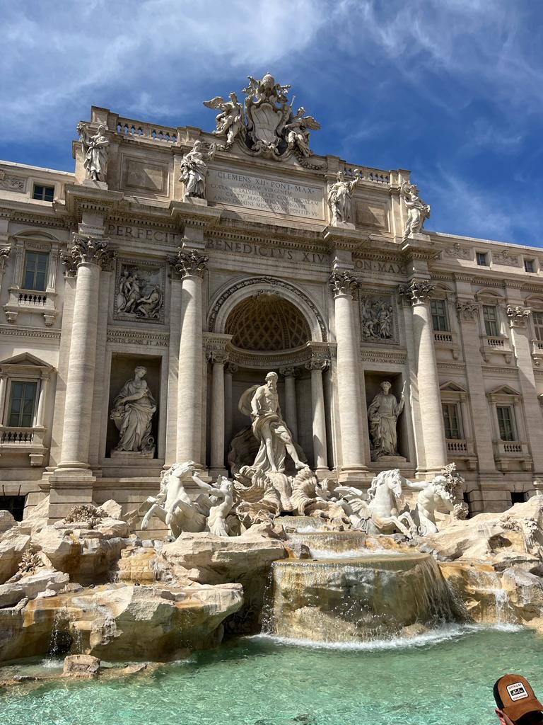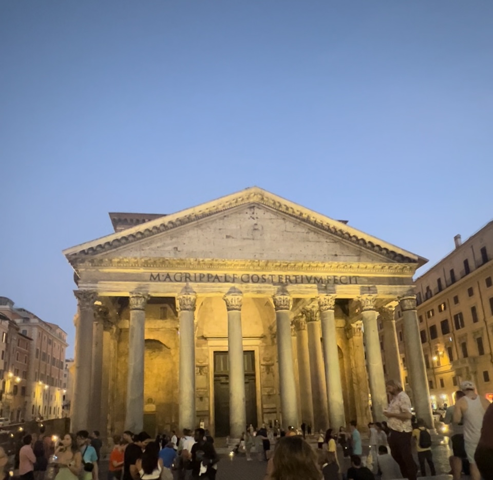 Here’s something that blew my mind – the Pantheon is built on the site where a temple used to stand that was commissioned by Marcus Agrippa around 27 BC! Sadly, that structure burned down. The Roman emperor, Hadrian, had the Pantheon built between 113-125 AD. There is no actual inscription of the date of construction because Hadrian wanted to keep the inscription of the original temple commissioned by Agrippa. There is a beautiful dome inside that has an opening (called an oculus) to the sky. The entire building is extremely well preserved for being over two thousand years old, maybe because it has been in continuous use since it was constructed. (The Pantheon is the third photo.)
