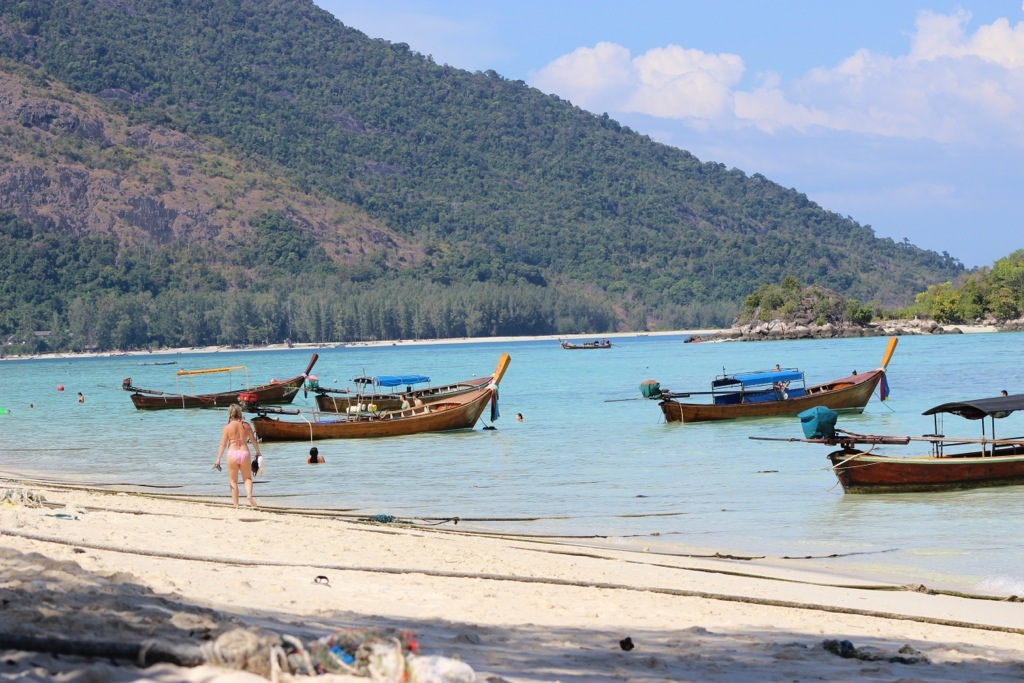 Longtail boats line the shore bringing people back and forth to the island constantly. They were designed to be easily made (no assembly line necessary.) The motors are usually old car motors that are attached to a long pole with a propeller on the end. The boat guy has to be pretty strong to “steer” as he has to put his entire body weight into maneuvering the motor. Colorful Buddhist scarves are tied around the front of the boat to keep it safe. The guys have a total sailor mentality. They often have a cigarette hanging out of their mouth and they have a cool, gritty energy. I like how the guys squat on the bow of the ship and just look out at the ocean. When they see another longtail boat go by, they often make hand signals to the other sailor.