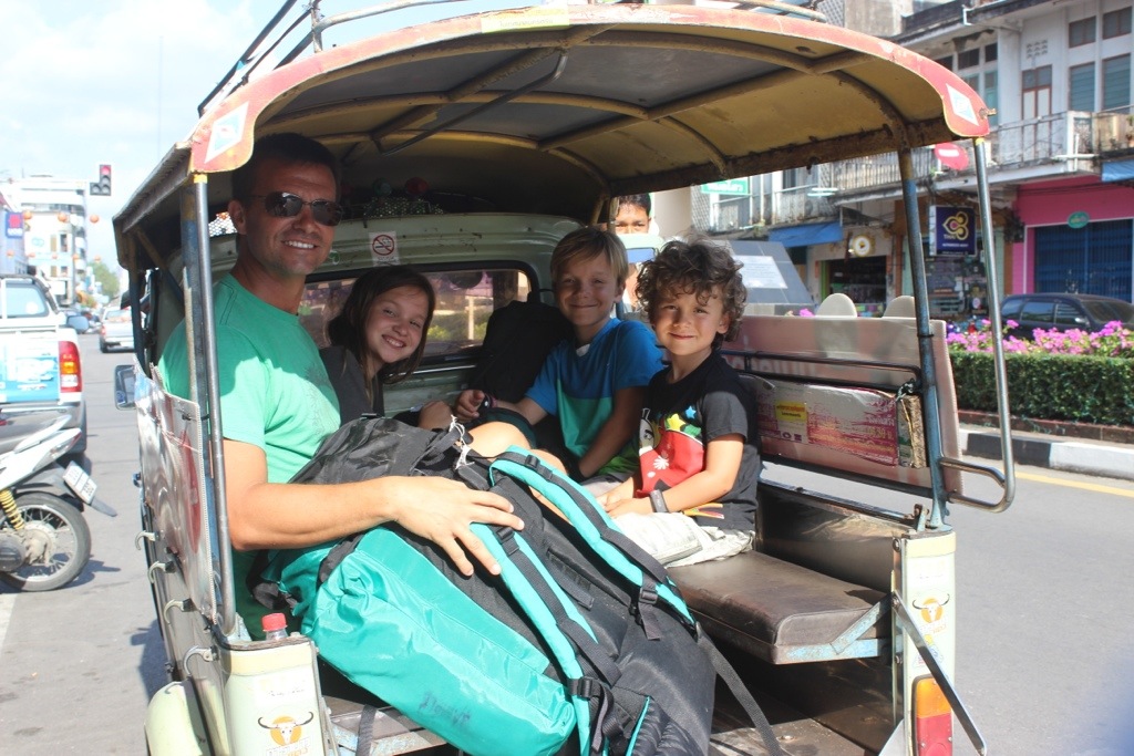A tuk tuk is like a motorcycle or three wheeler rickshaw type taxi thing. The back or side can be small or almost as big as a pickup truck to hold people. We just saw one today that was packed with so many people that all you could see were some arms, legs and backpacks smushed up. We rode on one in Koh Lanta that was built on the side of a motorcycle. I was in the very front. Usually, I love this stuff because it goes so fast and it’s loud and windy. On this one, however, the little rickety thing was weighed down heavy with our bags and I kept thinking that if a tire pops, I’m going to be the first one flung into a tree! Some of the drivers bedazzle the heck out of these things- from killer sound systems, to flashing lights and disco balls. (Trang, Thailand)