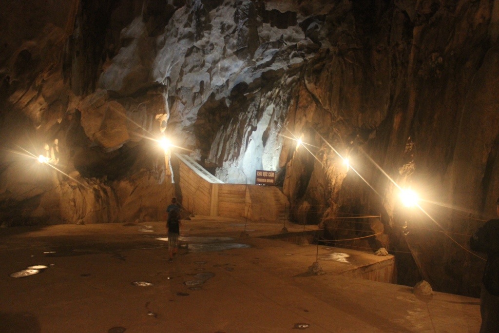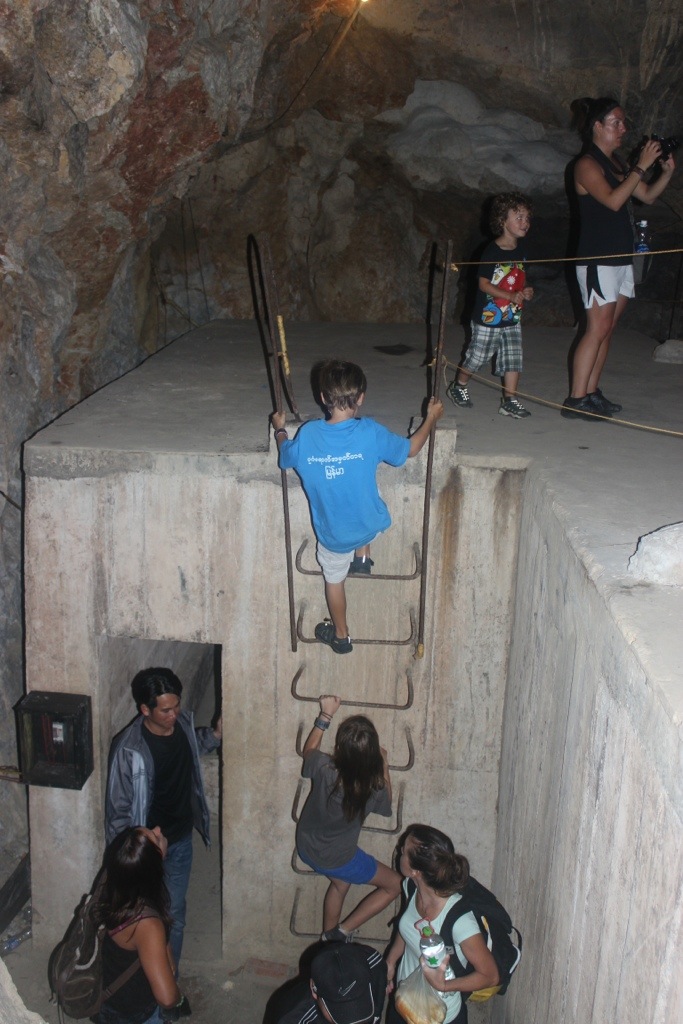 This cave was insane! Walking up to it was no big deal- you walked a little off the road, climbed a tall ladder and were left standing in a cave with a high ceiling. A guy came up and opened a small steal door that you had to crouch down to enter. Inside was jaw dropping- during the war, a three story hospital was built inside the cave to care for Vietnamese soldiers. It had patient rooms, operating rooms and a generator supplied electricity when it was a working hospital. It also had a movie theater next to a training area to practice running under and hiding in cave holes. A small pool off to the side served as a therapeutic pool. Another smaller pool on the lower level helped to break the fall of soldiers needing to evacuate quickly. They could jump straight down three floors and head out to the jungle. The cave was always a comfortable temperature staying warm in the cooler months and cooler during the hot, muggy summer.