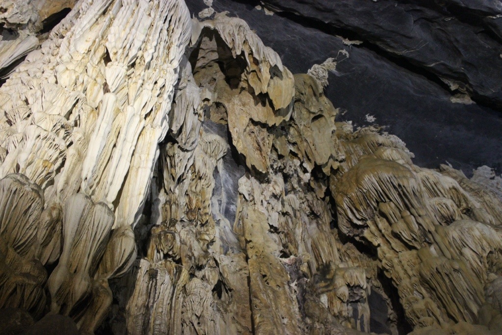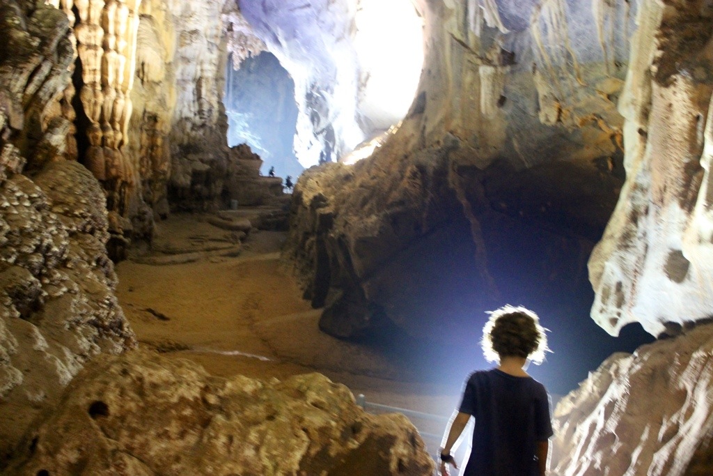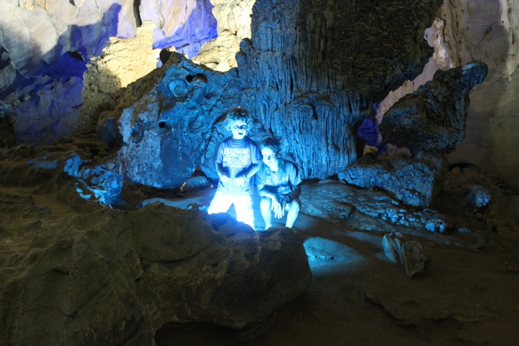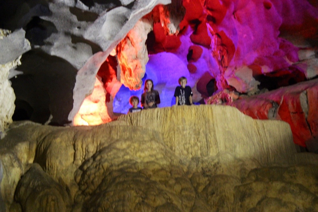 Once you reach the cave, you can only explore about a kilometer of it, but the guidebook says that it will gradually open up as more tourists come. She rowed us to different caverns where we could get out and explore. This cave was amazing, but I thought Paradise Cave was much more tranquil. It had white lighting, which was pretty. The colored lighting in Phong Nha was a bit much. Paradise Cave was serene and other-worldy. We pretended like we had landed on Mars!