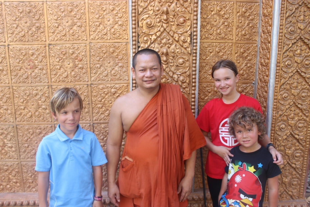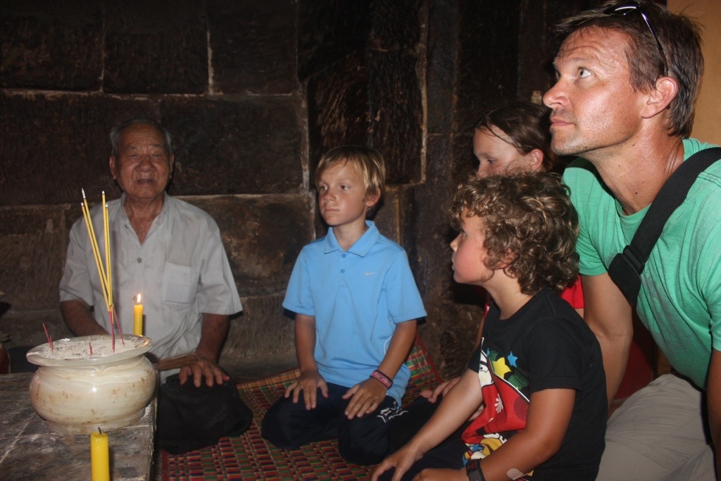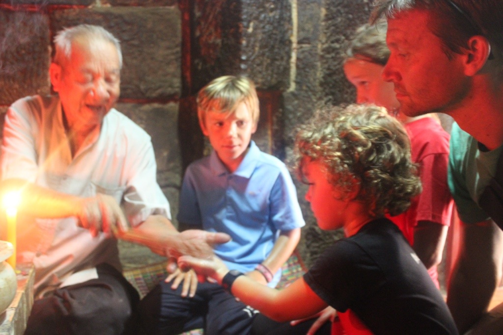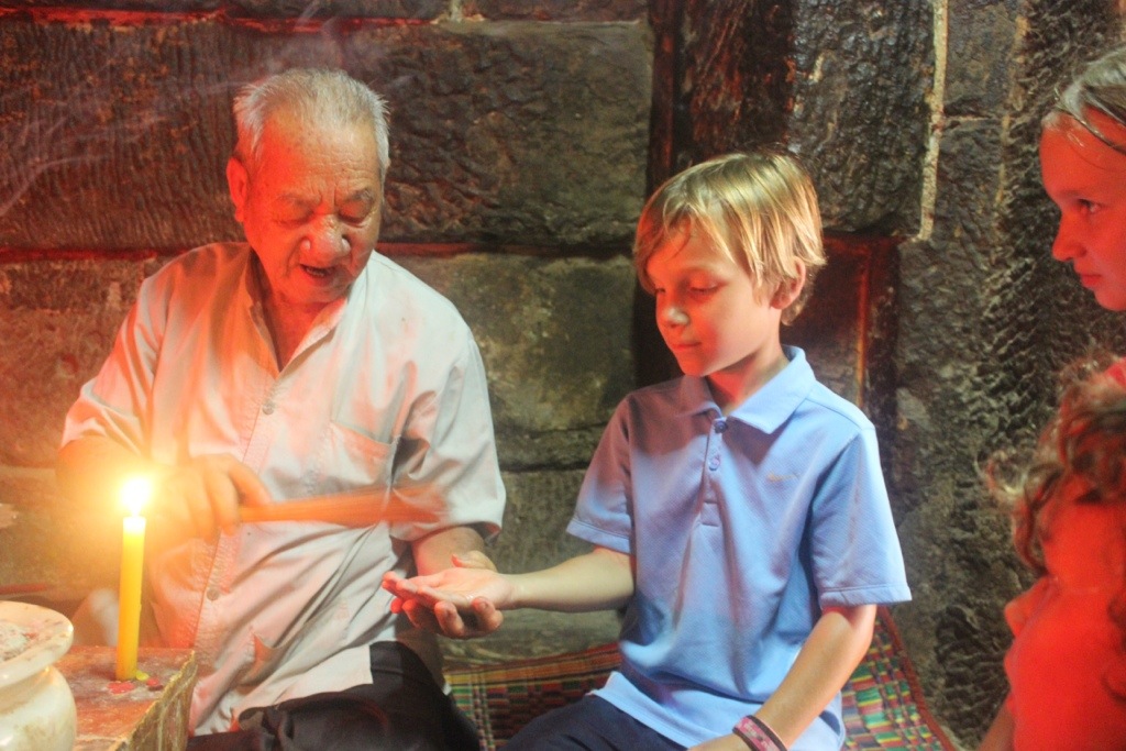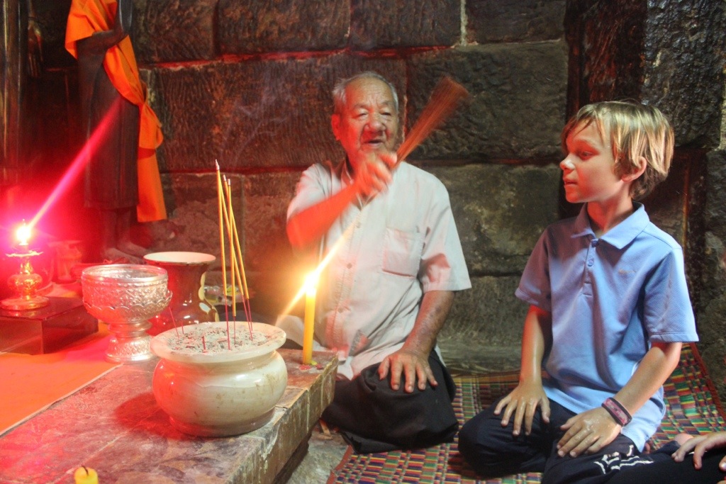 We walked around and couldn’t find the temple. A monk walking toward us said it was right behind us. There were two women at the front gate who said the temple was closed, but she went to talk to a man. The man in this picture unlocked a little door for us, showed us the eyebrow Buddha and performed a blessing just for us. He blessed some water and spritzed it on us with a small bundle of sticks. Then he did some chanting while rubbing the sticks on each of our hands- afterwards, we rubbed it on our faces. We burned incense and placed it in the sand. It was really cool.