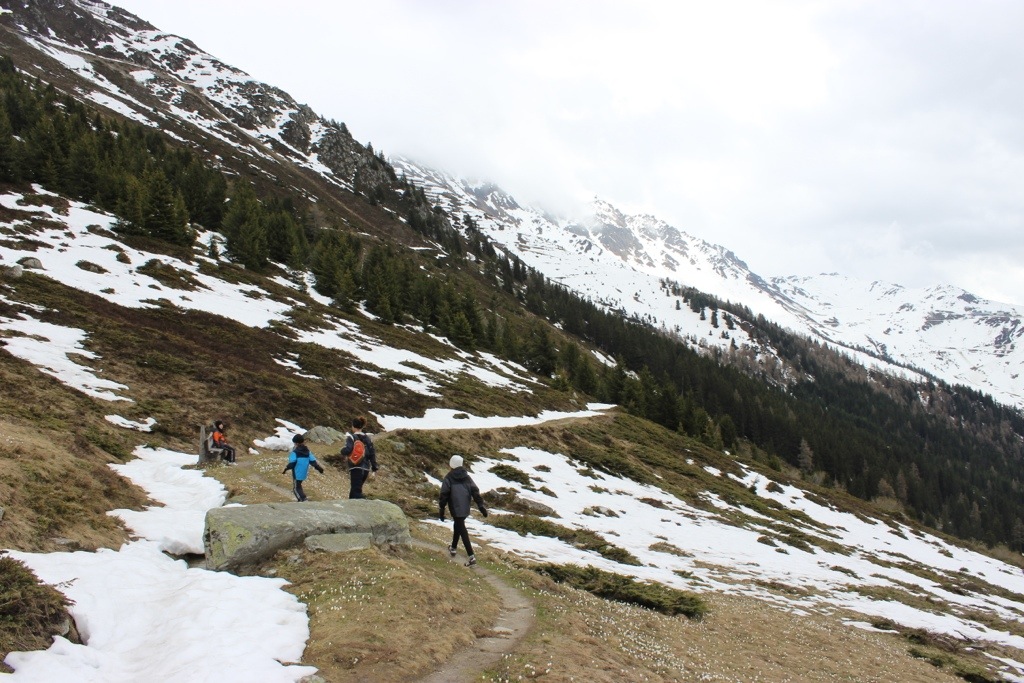 We were going to have a relaxing day but decided to take a hike to see if we could see some snow. We did and we were, actually, quite excited. (Probably hard to believe for friends and family who are just ending pretty brutal winter months!) While hiking we came across wood carvings in trees- a shovel, a butterfly, edelweiss, a saw and a pinecone. We were surprised that people leave them alone. We followed the clearest, cleanest stream we’ve ever seen. I walked back while Jesse and kids kept going. When they got back, they were so excited about a beaver type animal they saw, crocuses and guys doing a running/jumping sport on the side of the mountain onto the snow. Pretty cool stuff in an unbelievably beautiful, serene part of the world!