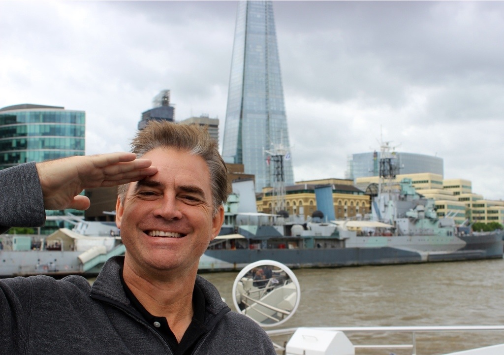 A boat ride down the Thames River. (Taylor was in the Navy- hence the pose.)