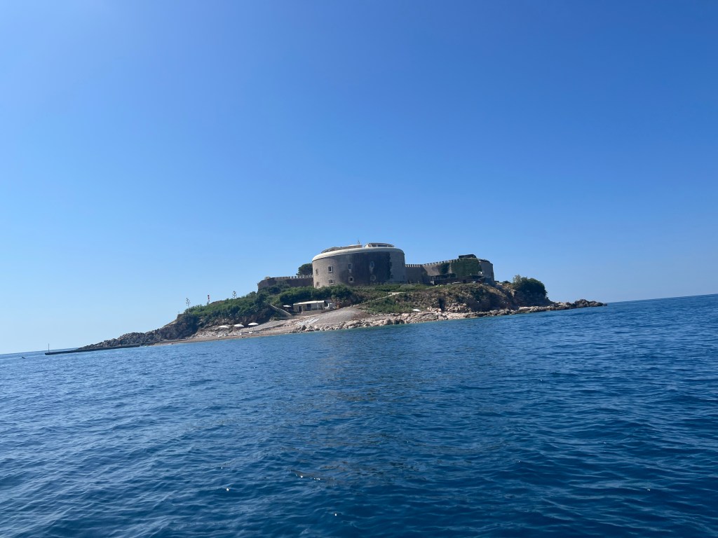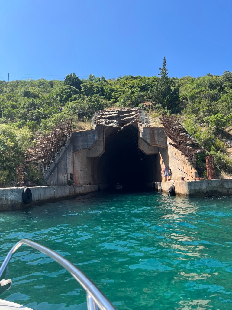 We went on a boat tour with a guide named Dragon. He was great. He took us to Our Lady of the Rocks. The island was formed by people stopping to drop rocks in the lake as an offering to the Virgin Mary. Now various religious buildings are built there. The tradition of dropping rocks is called Fašinada and continues today every July 22nd. If you look at the flooring as you walk along, you can see when a different area was added. We also went to the Blue Cave and swam around for bit. It is beautiful but there were a ton of tour boats in the cave so it was more fun to swim outside of the cave and look up at the cliffs. The submarine tunnels were the coolest part of the tour. The Yugoslav army dug tunnels to house u-boats and submarines. The entrance was camouflaged.