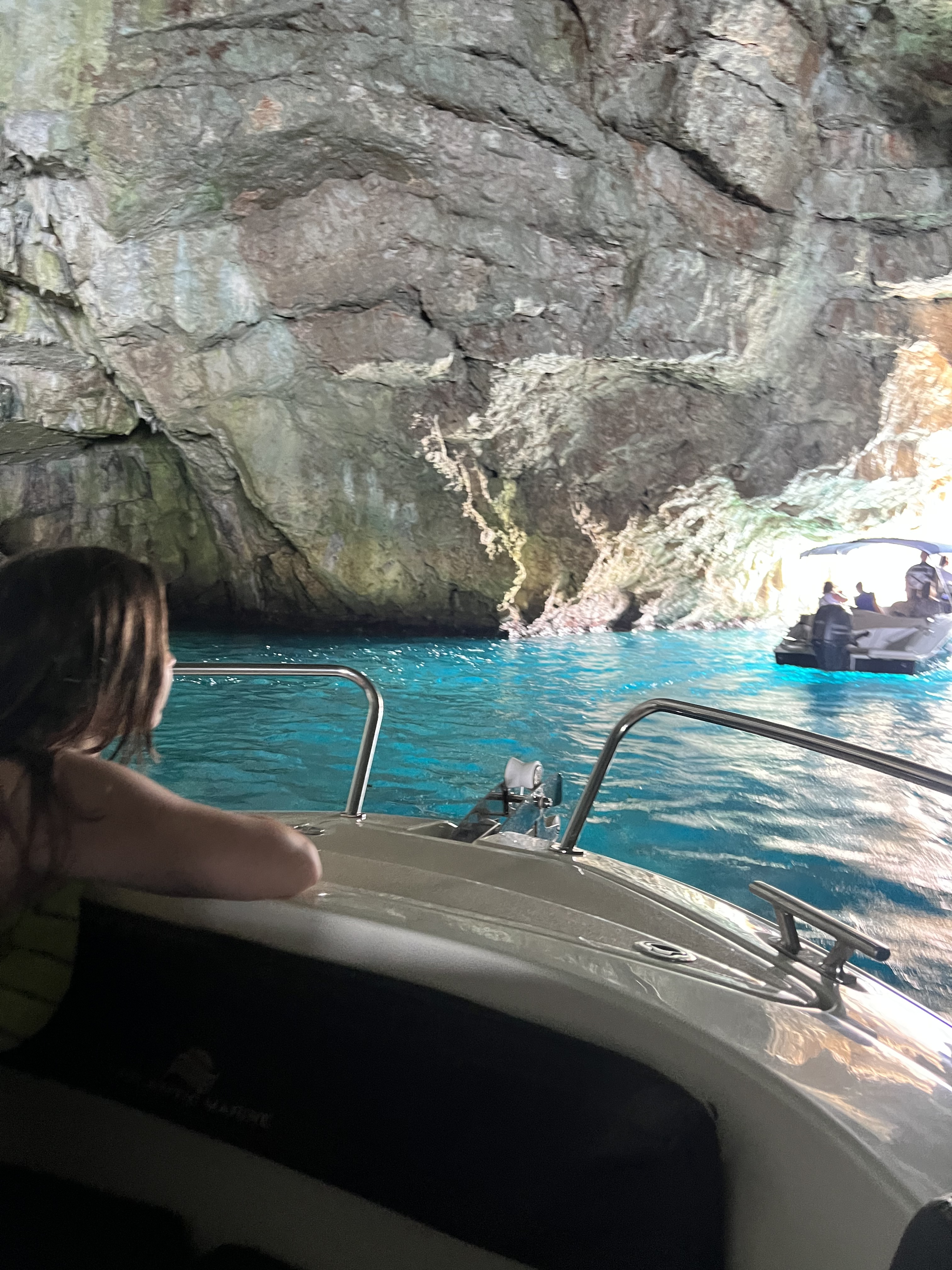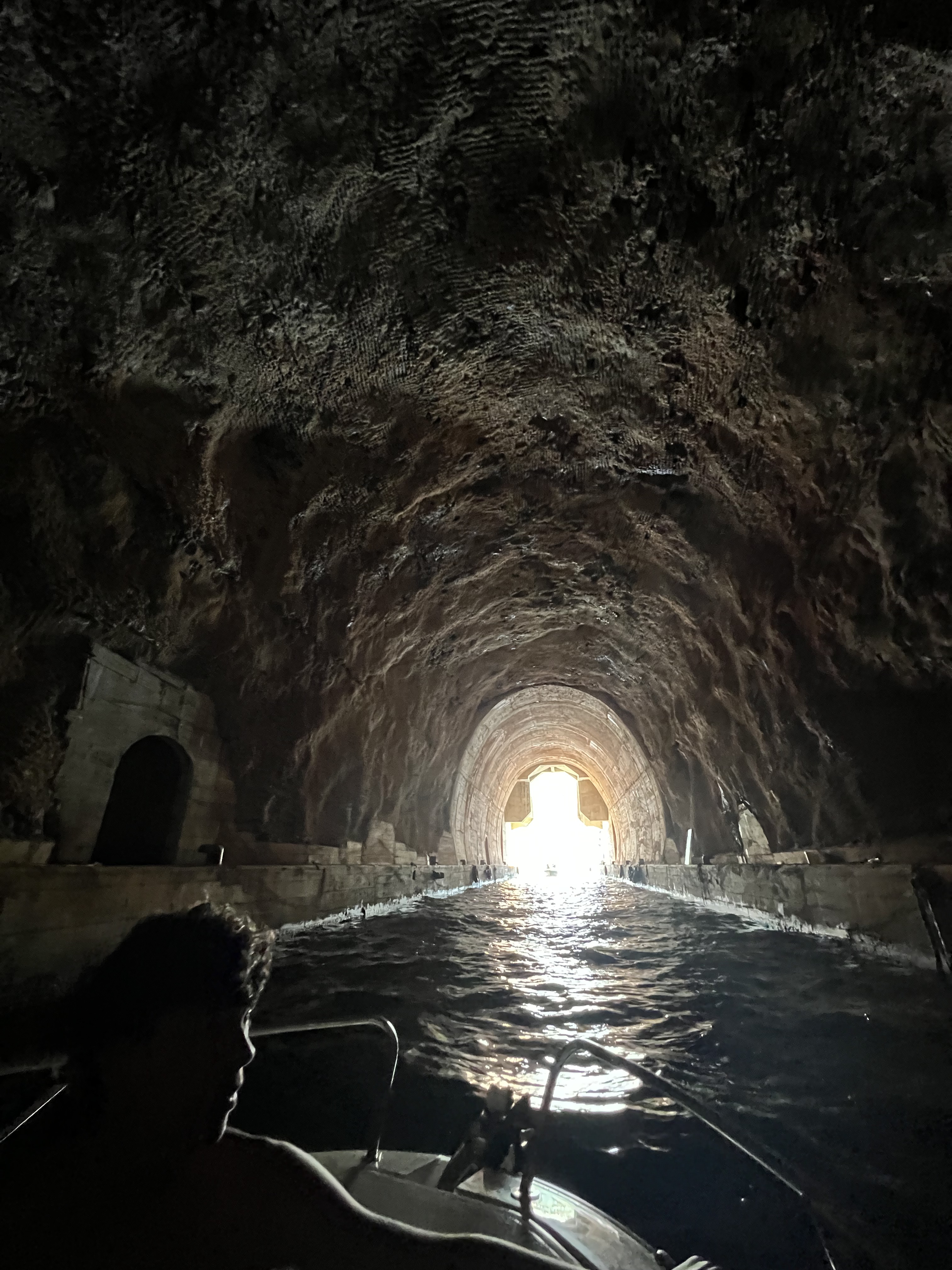 We went on a boat tour with a guide named Dragon. He was great. He took us to Our Lady of the Rocks. The island was formed by people stopping to drop rocks in the lake as an offering to the Virgin Mary. Now various religious buildings are built there. The tradition of dropping rocks is called Fašinada and continues today every July 22nd. If you look at the flooring as you walk along, you can see when a different area was added. We also went to the Blue Cave and swam around for bit. It is beautiful but there were a ton of tour boats in the cave so it was more fun to swim outside of the cave and look up at the cliffs. The submarine tunnels were the coolest part of the tour. The Yugoslav army dug tunnels to house u-boats and submarines. The entrance was camouflaged.