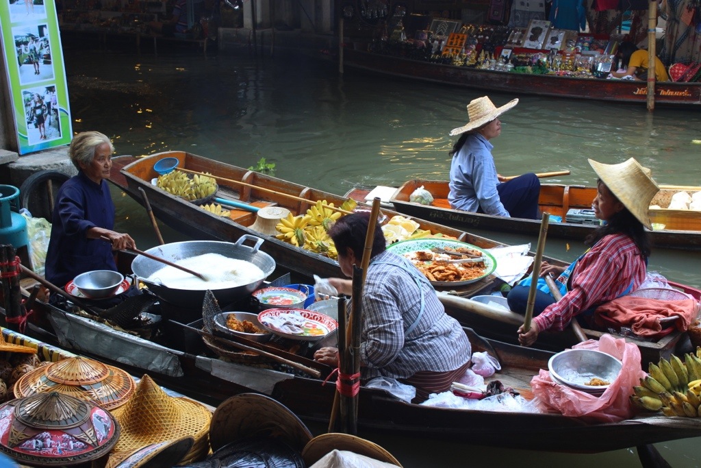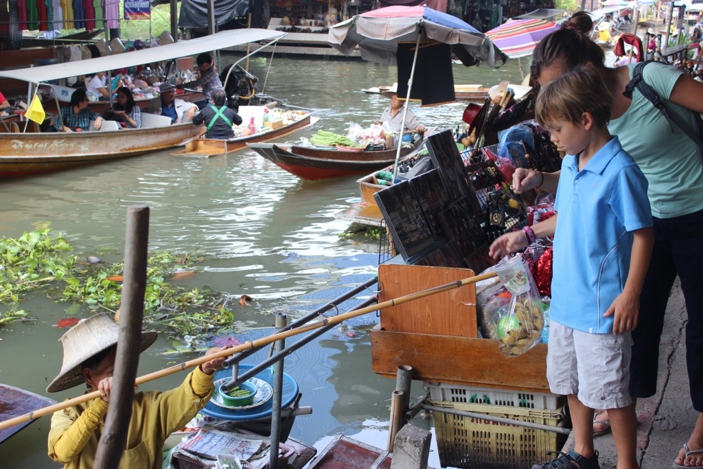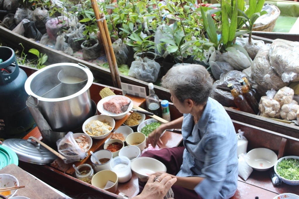 I didn’t really understand how this worked until I saw it. There are some shops you have to get to by boat, but mostly the boats come to you. They float their boat over to the side and see if anyone wants to buy anything. You tell them what you want and they put it in a wire basket attached to a long pole to get it to you. You take your item, put cash in the basket and that’s that. If you stand back and observe for awhile, you’ll see that there is definitely a method to the madness with boats constantly coming and going. I loved watching women that looked like they were well into their 90s squatting on their boat, selling their stuff and rowing over to stop and chat with friends along the way.
