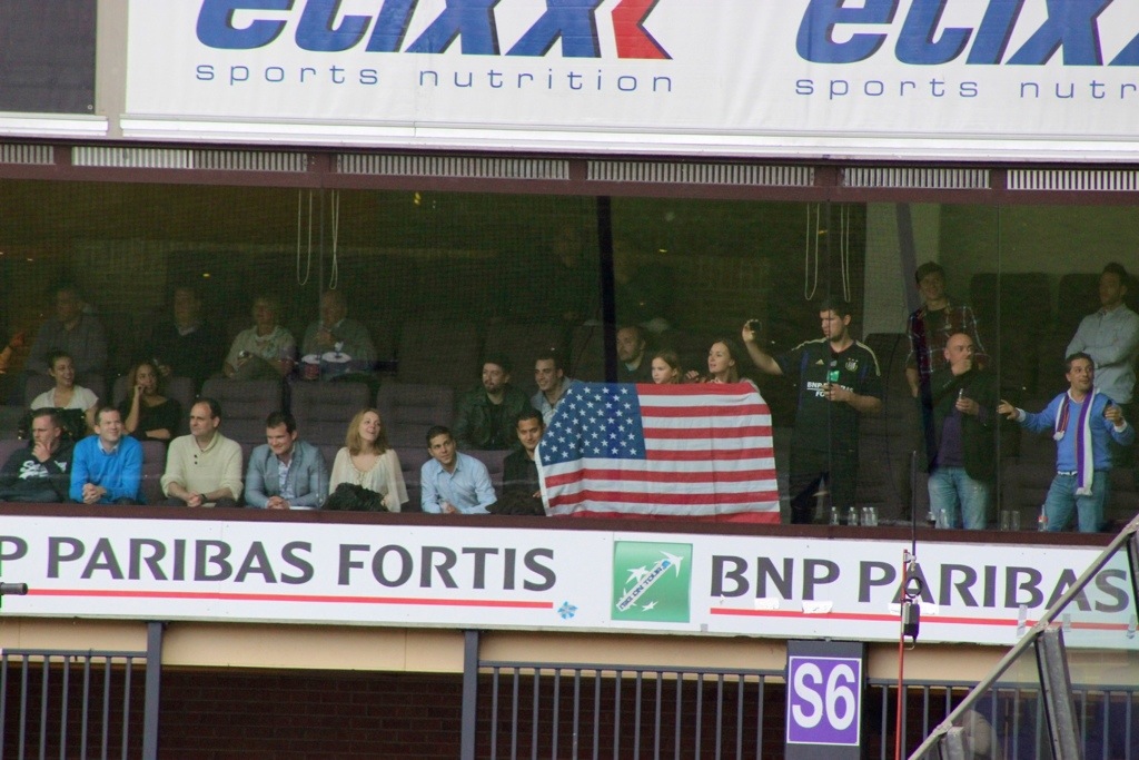 Sacha was running around the field with the American flag around his neck after the big win. Jamie (his wife) had given us one to bring to the game. We held it up where we were sitting. Always proud! Woo-hoooo!
