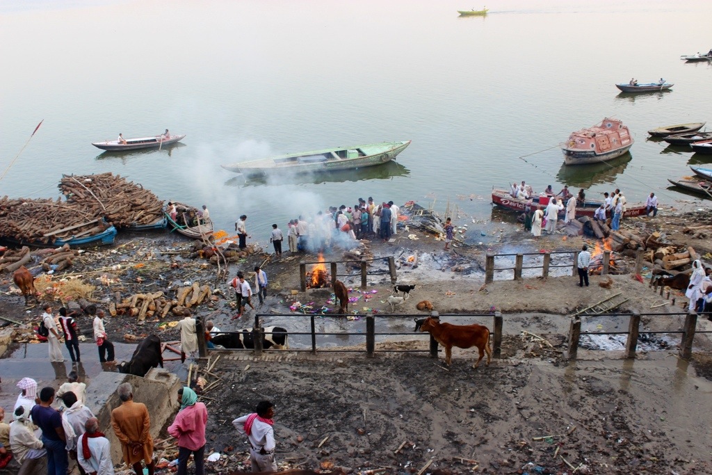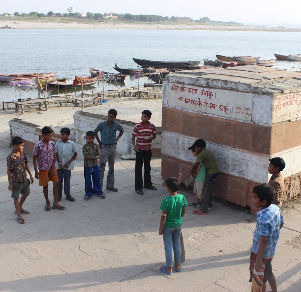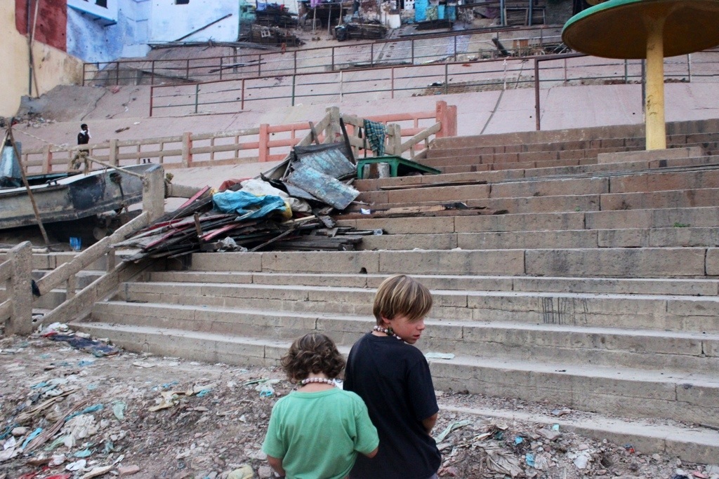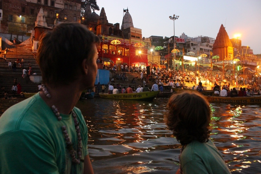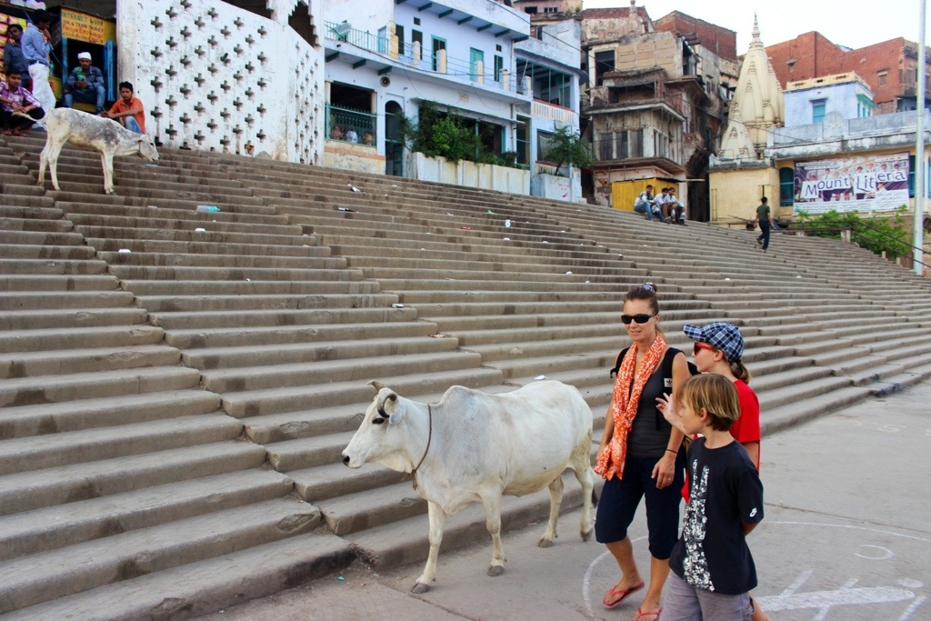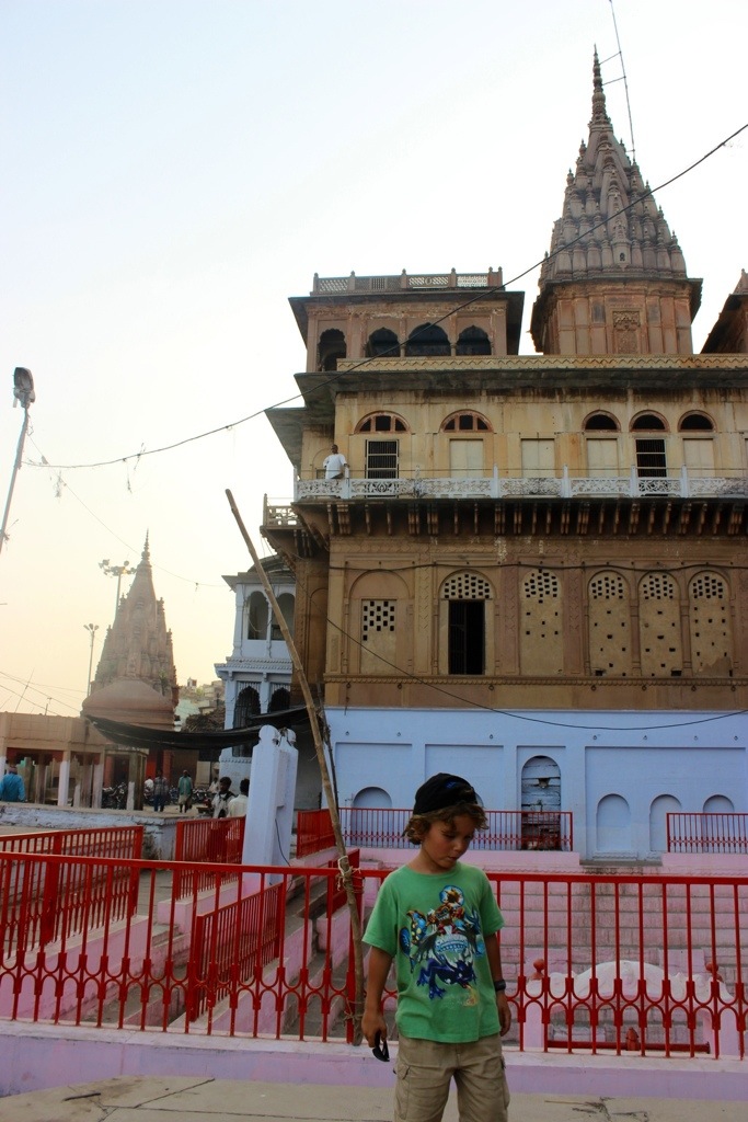 The Vishwanath or Golden Temple, is dedicated to Shiva and it is the most famous temple in Varanasi. It is located off an alley in Old Town, the entrance is an odd looking, old metal detector screenerDuring the busy season, this temple is usually off limits to foreigners, but we gave it a shot and got in. By coincidence I had thrown our passports in my bag because the hotel was a bit shady. We were frisked twice after we entered then the security guards took us to a place where we had to show our passports and they recorded our information into an old, large book. We followed a crowd of Hindus past an engraving that read “No Hindus allowed beyond this point.” We had lotus flowers to put into a pit that had a statue in it and water from the Ganges. Other people brought milk, money and fruit as offerings to the gods. We walked out into a mob of people and monkeys to another temple that had a big ball in it that was also filled with Ganges water. Flowers were flying, monkeys were climbing and the smell of sour milk hung heavy in the air.
