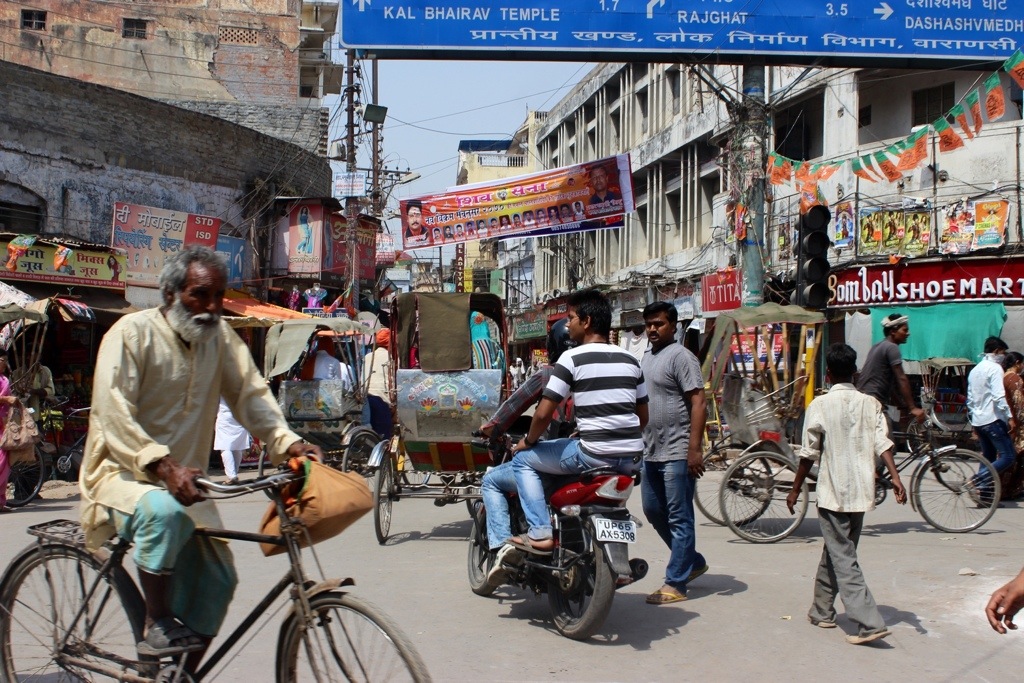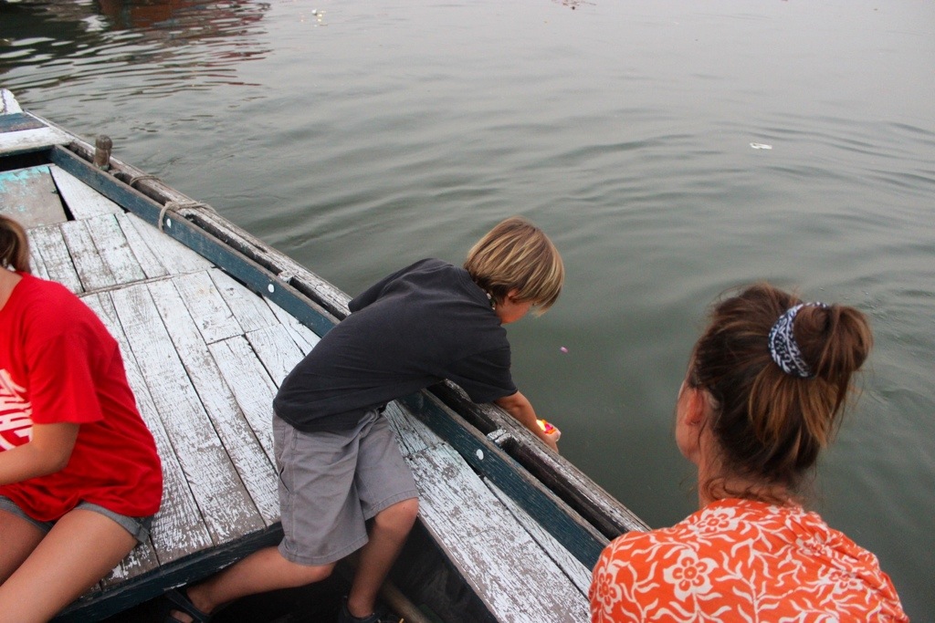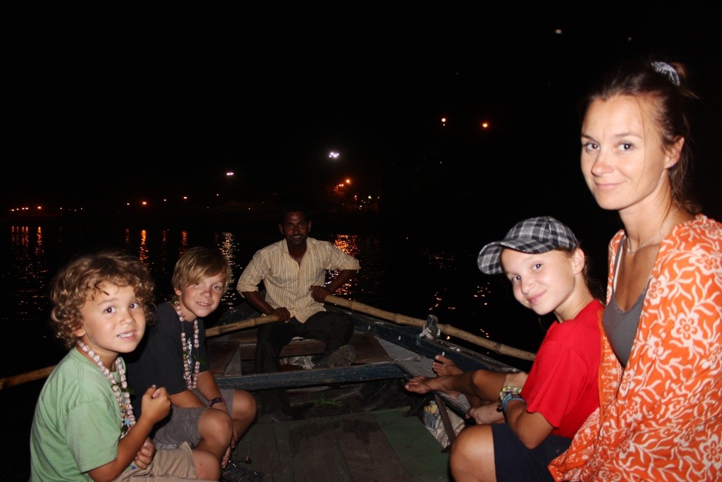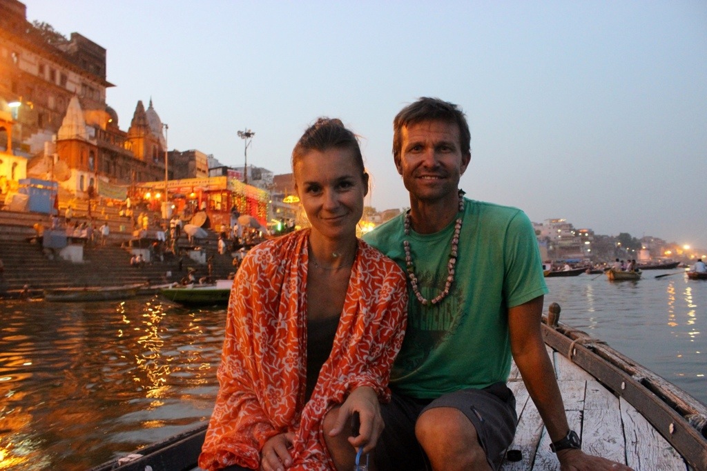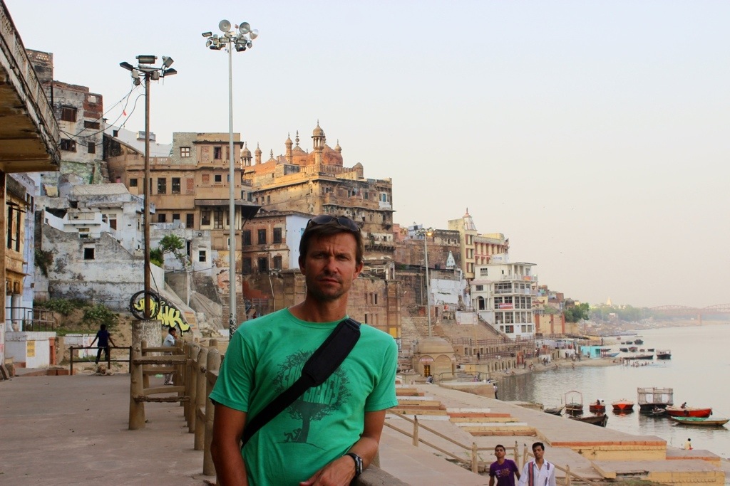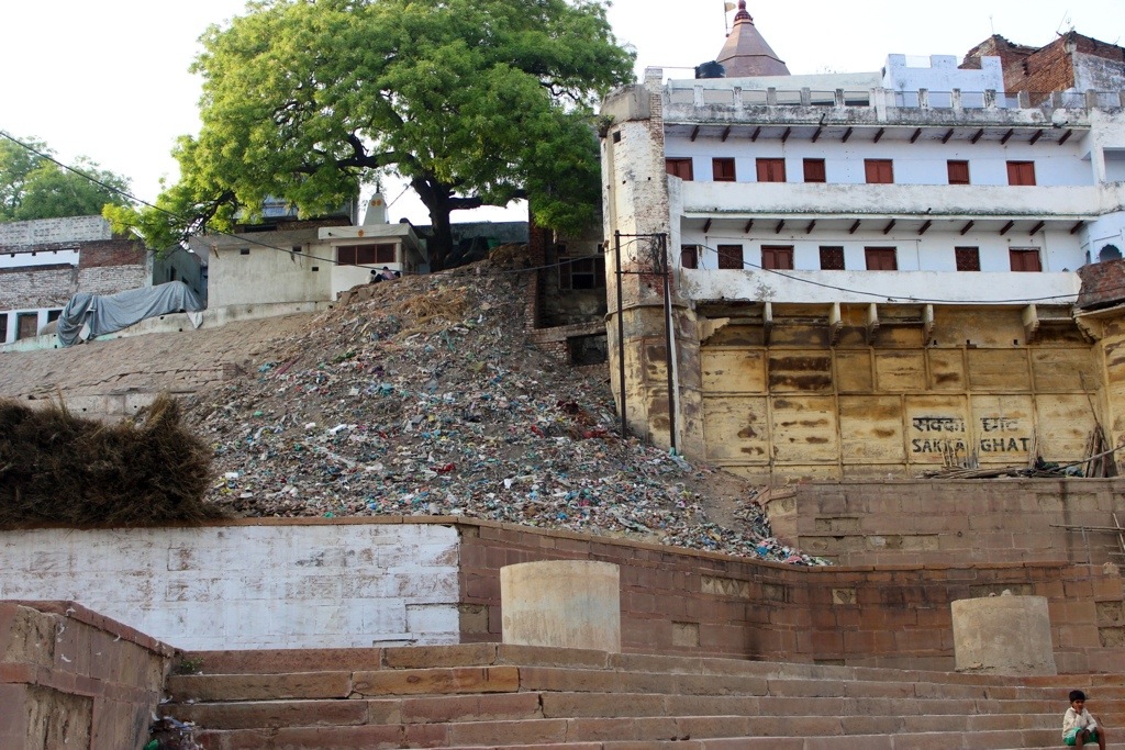 The Vishwanath or Golden Temple, is dedicated to Shiva and it is the most famous temple in Varanasi. It is located off an alley in Old Town, the entrance is an odd looking, old metal detector screenerDuring the busy season, this temple is usually off limits to foreigners, but we gave it a shot and got in. By coincidence I had thrown our passports in my bag because the hotel was a bit shady. We were frisked twice after we entered then the security guards took us to a place where we had to show our passports and they recorded our information into an old, large book. We followed a crowd of Hindus past an engraving that read “No Hindus allowed beyond this point.” We had lotus flowers to put into a pit that had a statue in it and water from the Ganges. Other people brought milk, money and fruit as offerings to the gods. We walked out into a mob of people and monkeys to another temple that had a big ball in it that was also filled with Ganges water. Flowers were flying, monkeys were climbing and the smell of sour milk hung heavy in the air.