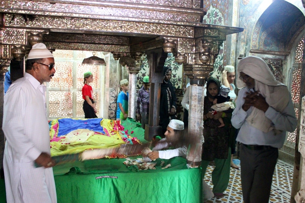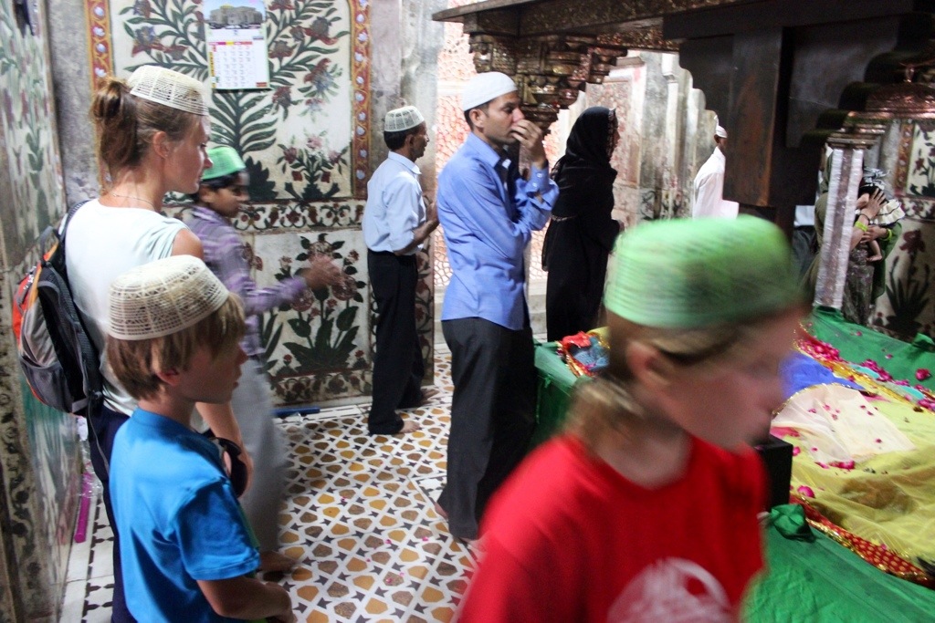 They give you a little plastic hat to wear as you walk around the holy man. People are coming in and touching their babies heads to the tomb. Others leave flowers and money.