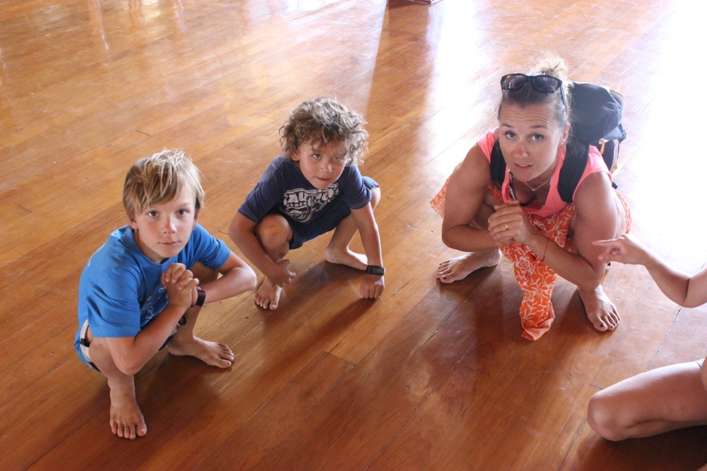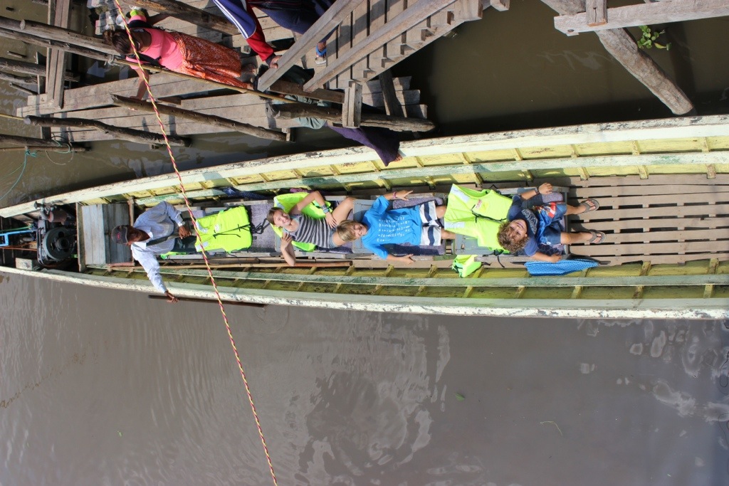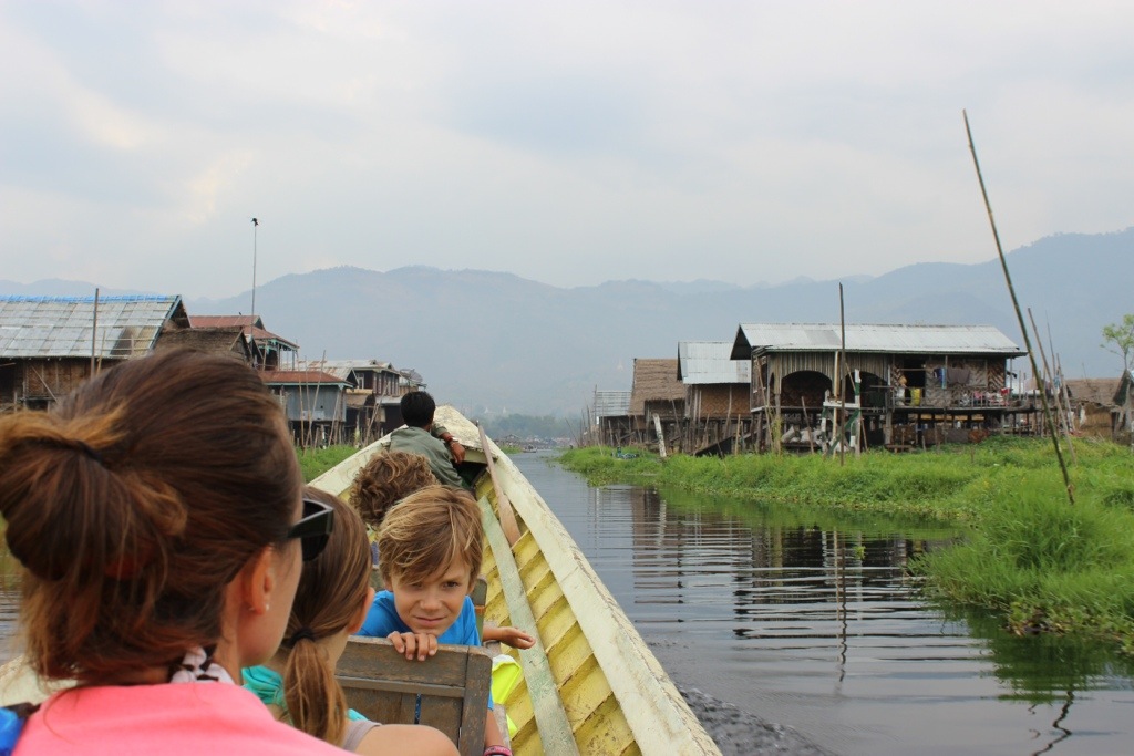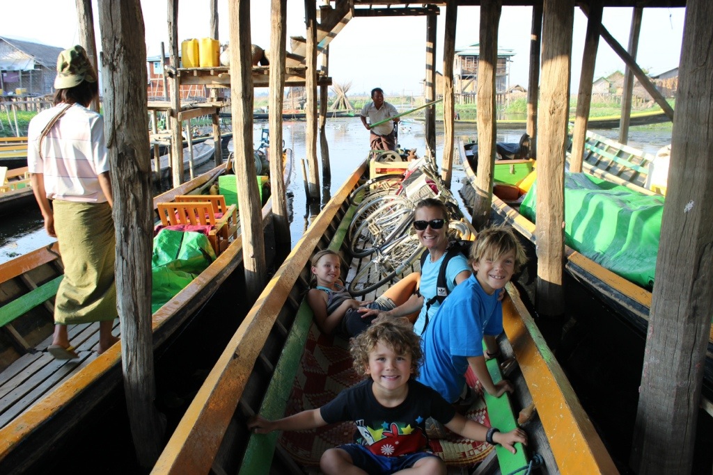 We are all set to go into the hot springs. They give us a tour. There is a place for foreigners. There are three decrepit looking hot tubs with green water in them. Em says, ” no, thanks.” I’ll do whatever. Boys want to do it- Jesse thinks we should head back on the bikes. Maddux and Lennon go in and last about 20 minutes, then we all decide to go. Two minutes into our trek back and Jesse’s tire pops- again! We laugh! I laugh longer than necessary, as usual. I find a guy who will take us across the lake on a boat to the town where our hotel is located. We have to go to a village to go on the guy’s friend’s boat. The village is beautiful. Everyone is waving at us. People are happy, the sun is setting- we were meant to be there at that moment. Everything DOES happen for a reason. We had a most amazing boat ride back!