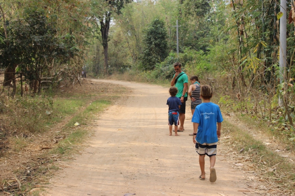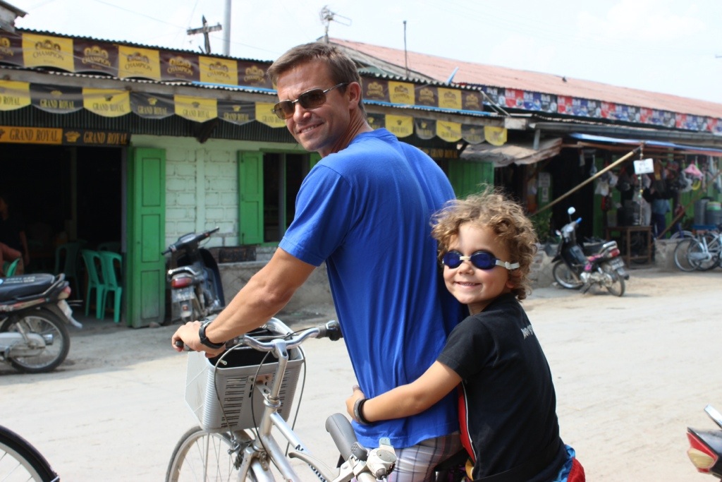 This was a weird adventure. We had to find a bike that Lennon could sit on. We also needed bikes that wouldn’t be too tall for Maddux and me! Mission accomplished- we were on our way. The road to the hot springs was crazy rocky, dusty and busy. It was pretty much one lane where cars and motorbikes had to pull over to the side and bikes and pedestrians were kind of pushed off the road. 33 minutes into the hour ride and Jesse’s tire pops. We walk to a main road and the kids and I keep riding while Jesse jogs along with the bike and Lennon. It is hot, people are thirsty- this doesn’t work for long. Jesse sees a guy hauling big oil barrels on a tuk tuk and asks if he can get a ride. They can not but they find a guy who can. Jesse, Lennon and the bike go ahead of us. We don’t know where we’re going but follow. After Maddux, Em and I arrive at the hot springs- we wait for J and L. They should be there already. Eventually, they walk in! Yay! We didn’t lose them. Jesse goes to get the bike from some kids who repaired it- they want the equivalent of a dollar but Jesse is so happy to have the tire fixed, he gives them much more and they are happy!