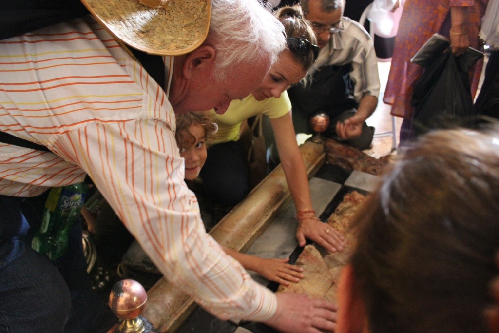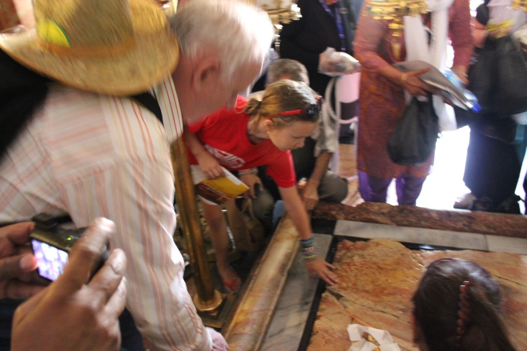 It is customary for pilgrims to kiss the stone or rub it with oil and then wipe it with a handkerchief. Since we have learned so much about Buddhism and Hinduism on our travels- we decided we would also learn more about Christianity, so we all touched the rock for a chance at becoming a bit holy. 🙂
