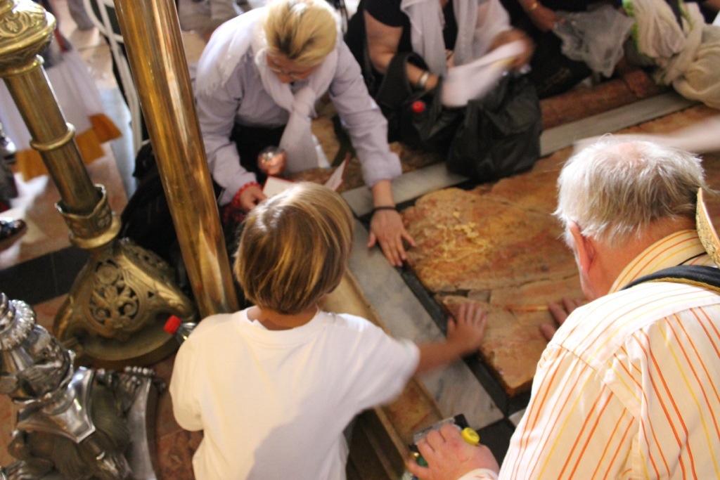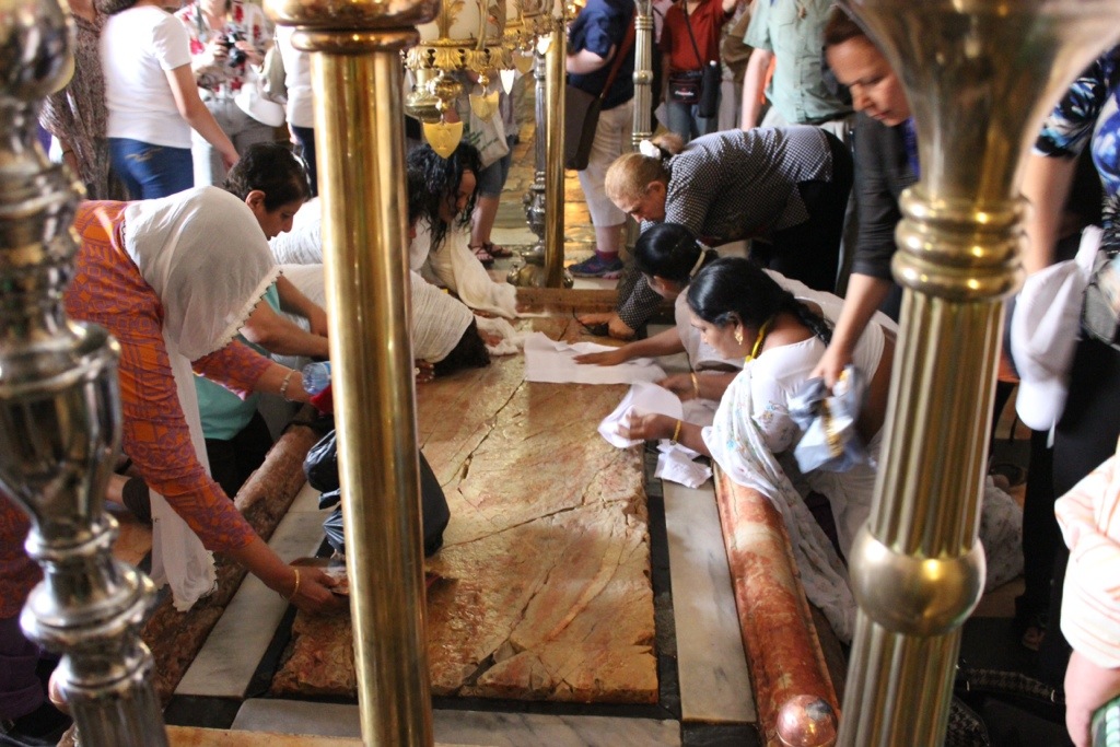 The Stone of Unction, also known as the Stone of Anointing. This is the place where Jesus’ body was laid down after being removed from the crucifix and prepared for burial.