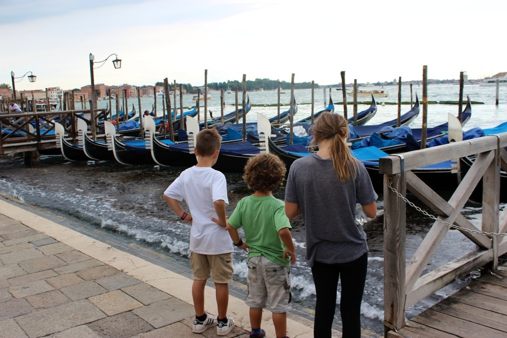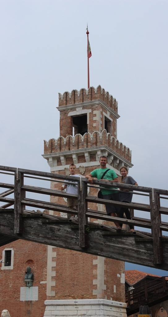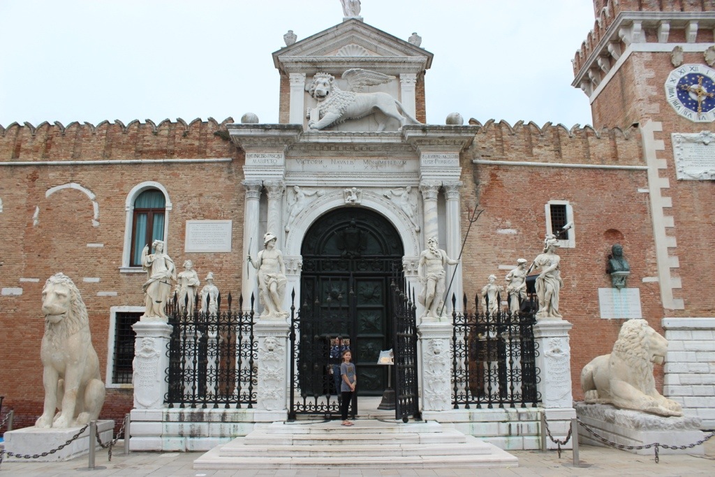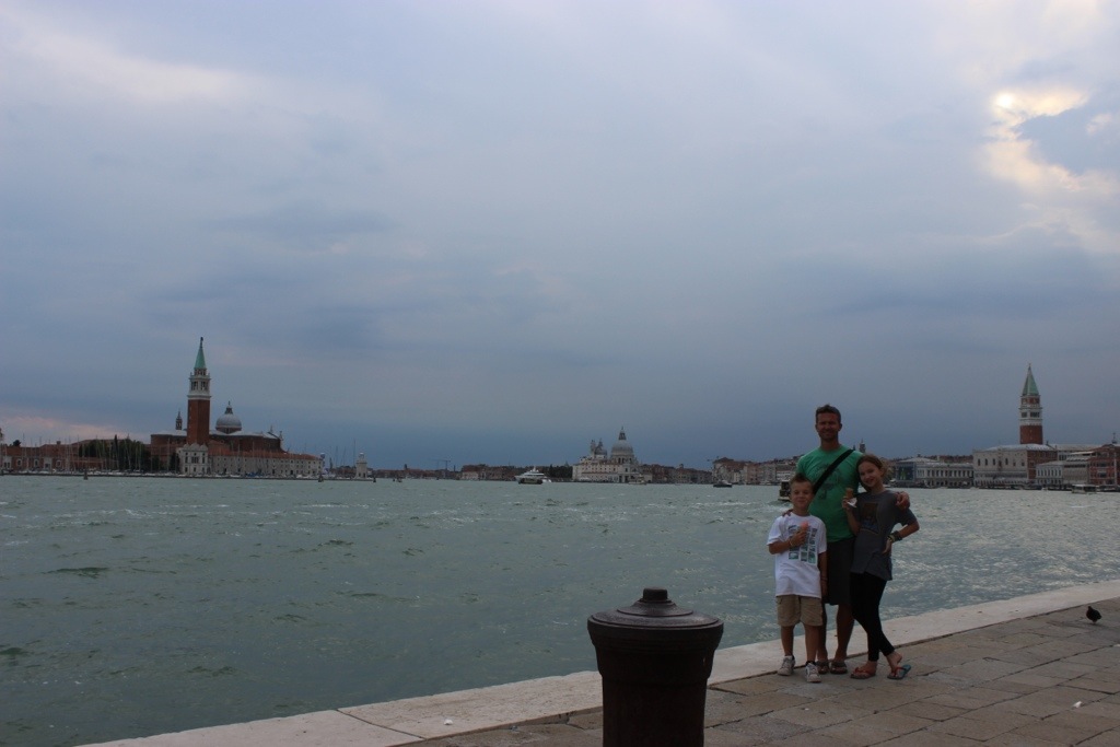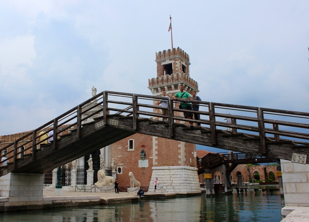 The bridge behind the kids is the Bridge of Sighs. It is an enclosed bridge made of white limestone that passes over the Rio di Palazzo and connects the New Prison to the interrogation rooms in Doge’s Palace. It was built in 1602.