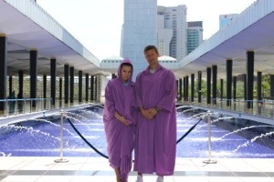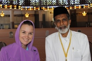 I had to wear the garb because Muslim women are supposed to resemble the Virgin Mary. Women must cover their hair and not let skin show. Some women only have their eyes showing. A woman can be touched by her mom, dad, siblings, husband and children but no one else. The double kiss, hugging, even shaking hands is a no-no. While we were at the mosque, a couple was getting married. They were sitting on fancy pillows in the middle of friends and family. A man was officiating and two other men who had to be righteous and at peace with their God spoke up in favor of the couple tying the knot. After the ceremony, a special card is made with a picture of the couple so they can legally check into hotel rooms together. They must have proof that they are husband and wife.
