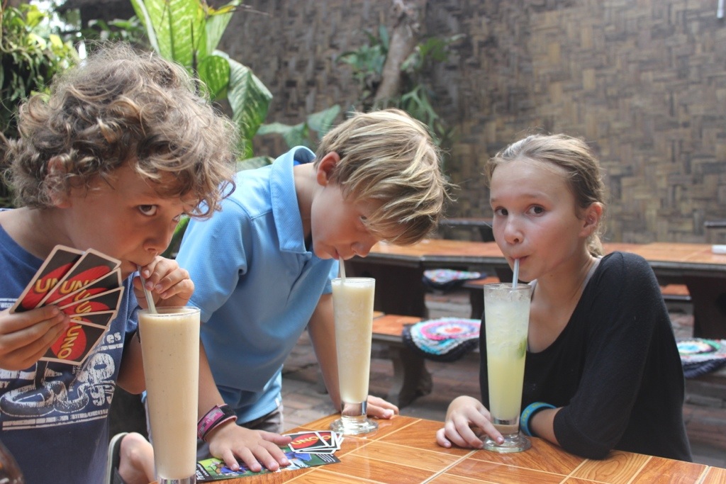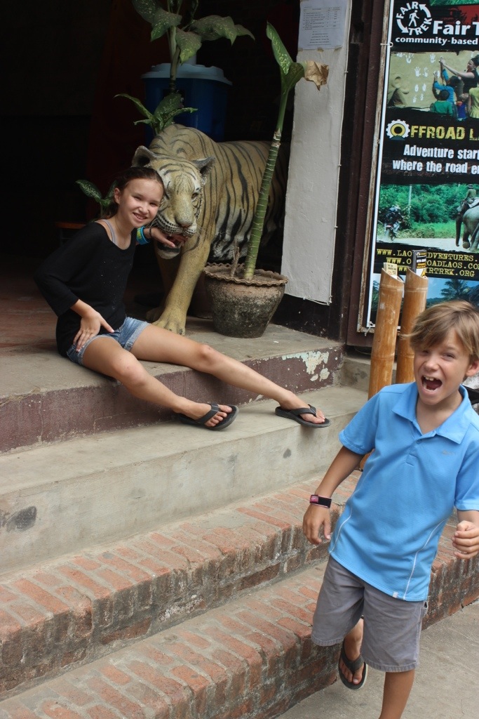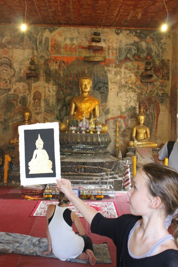 While visiting one of the temples, we saw a table with a display of little statues and painted canvases for sale. To the right of the art was a price list, a book to record what you bought and a bowl to put the money in. We bought the small canvas that Em is holding in the photo. A sign said that any money collected would be used to re-paint the inside of the temple. The bowl was full of money! I love how trusting these people are, but I can imagine if you did take anything- you’d probably get some pretty bad karma coming your way if you steal from monks!