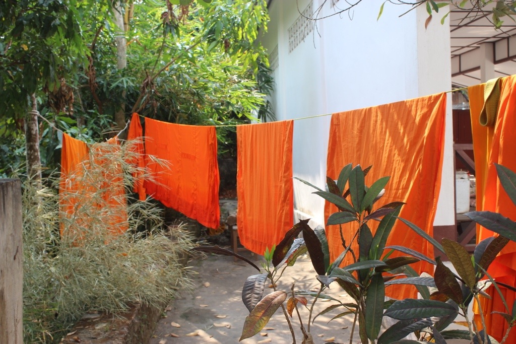 Centuries ago -robes were made from “pure cloth” – meaning cloth that no one else wanted anymore. The monks would collect old rags, wash them, then dye them by boiling with vegetables and spices like turmeric and saffron which gave the robes the bright orange/yellow colors.