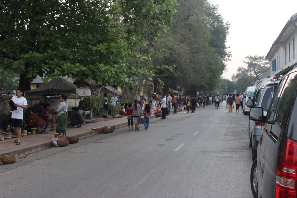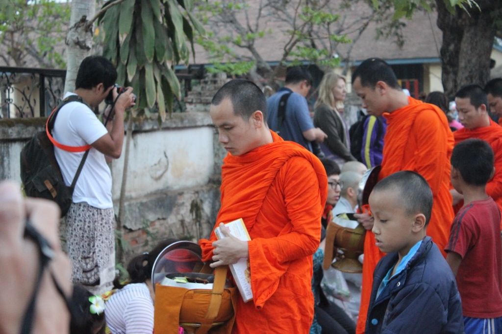 The monks form a procession that winds through the town to collect rice and other offerings from the towns people. I also saw some of the older monks giving food away. The monks are quiet and look down a lot making very little eye contact. It was cool to see, but kind of weird how some tourists get extremely close so they can take photos and pretend like they are part of the ritual. Buses of people come in to watch which seems to diminish the experience somehow. That being said, the colors of the monks’ robes are spectacular and to see them in a long line walking slowly was beautiful.