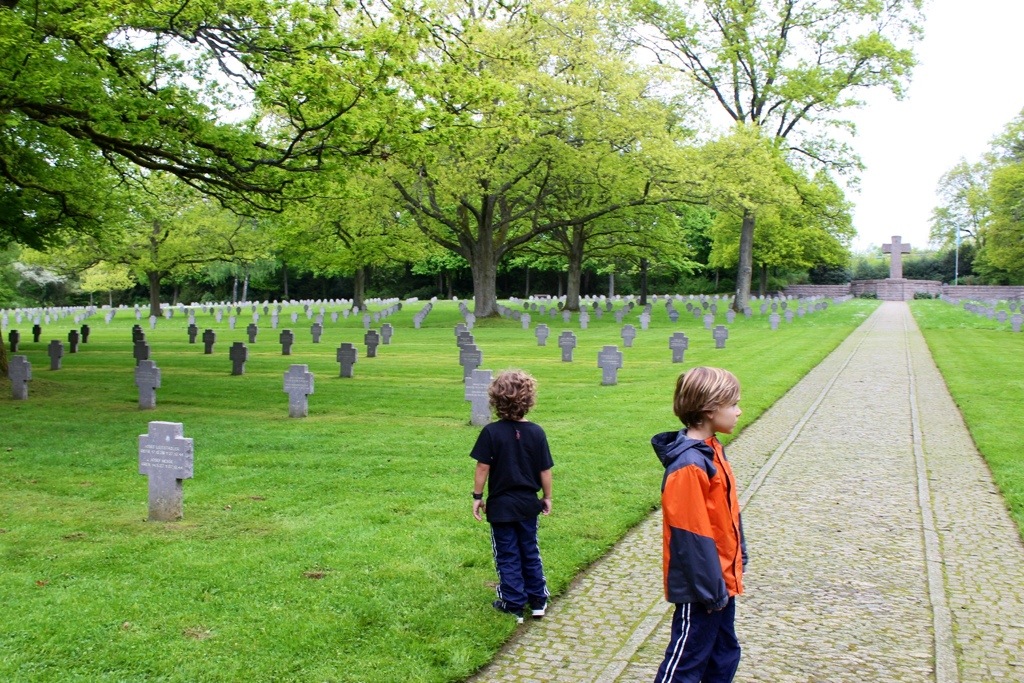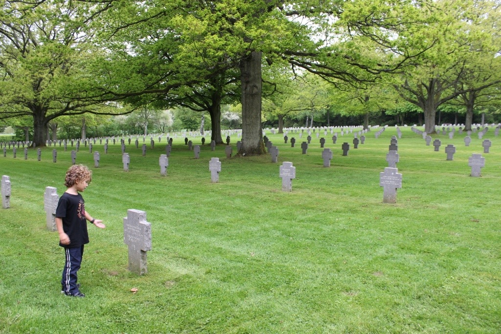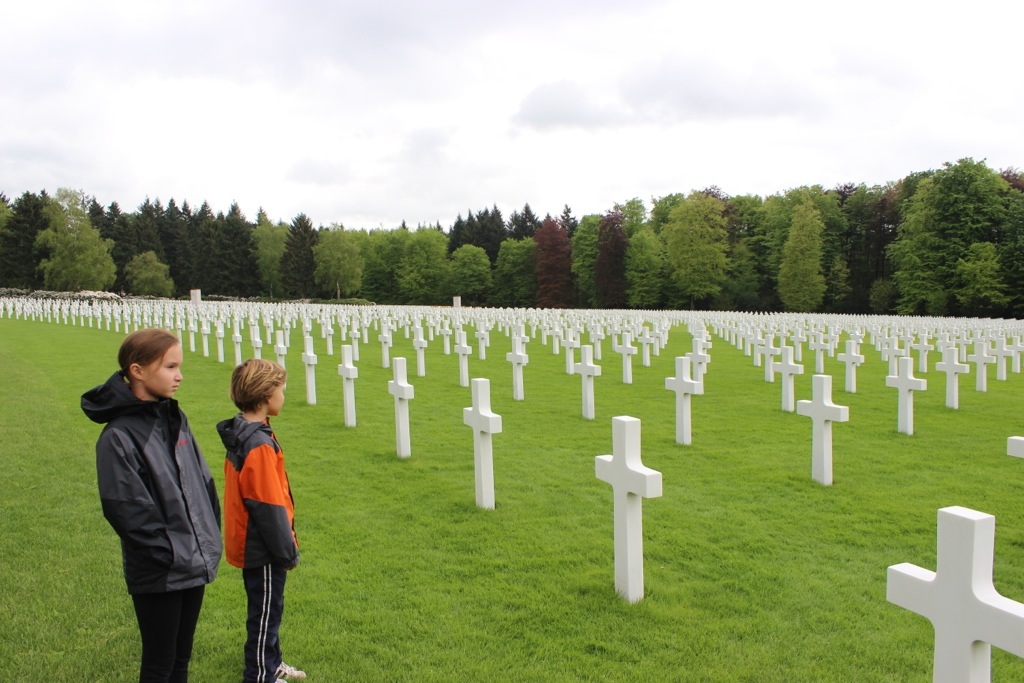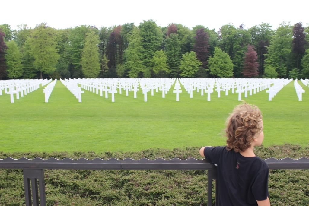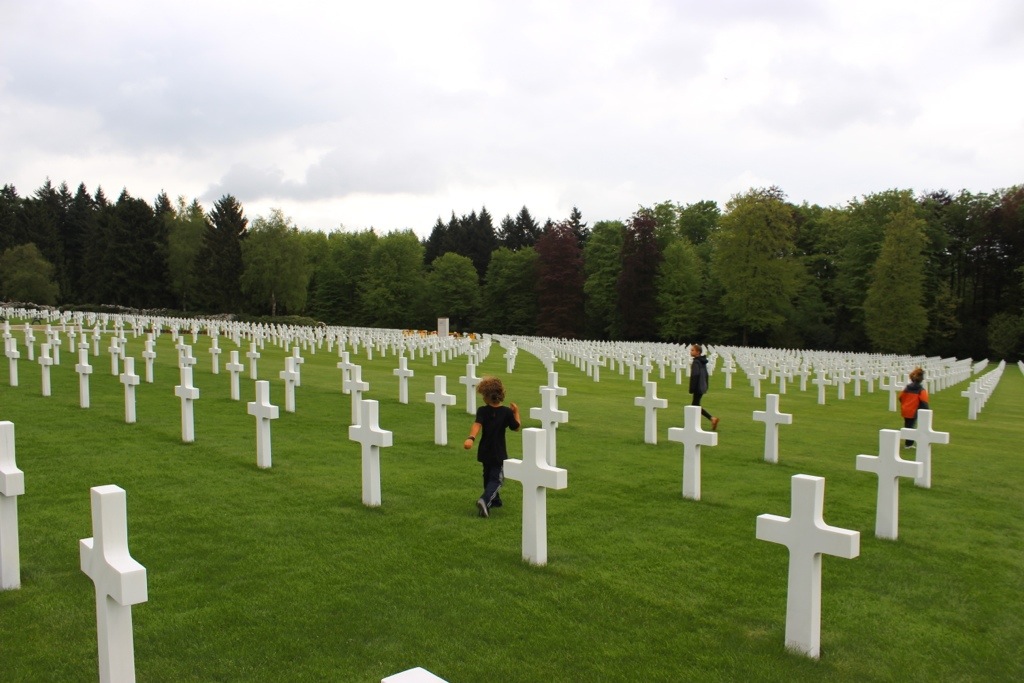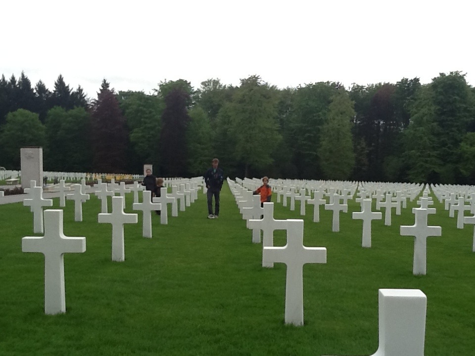 The energy of these cemeteries is so shockingly different- you can feel it right away. Each American has their own cross at the US cemetery, while at the German one, up to four names are on a cross (2 names on each side) and there are many “unknowns.” The US one is pristine with guides milling about ready to give facts and answer questions. At the German one, a guy with a leaf blower was the only person in sight. The grass was overgrown and it just seemed more eery. Perhaps it’s indicative of how people feel about that time in history- I don’t know. (?) We’ll have to do some research when we visit Germany!
