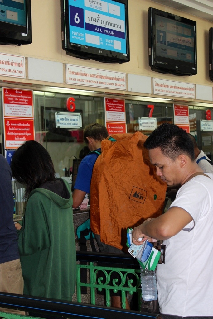 Jesse had to get up early one day while we were in Thailand to sort out our visas for India. He was gone for hours! He came back exhausted but successful. You have to have all your t’s crossed and i’s dotted- otherwise you are out of luck! The other picture is of Jesse at the train station in Bangkok arranging an overnight sleeper train to Chiang Mai. (The train smelled so badly of urine that I had to sleep with tissue stuck up my nose, but we got to where we needed to be. I may invest in a nose plug like some swimmers wear. I could have an entirely different blog detailing all the smells I’ve endured while on this trip.)