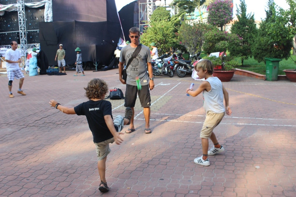 This park was buzzing with activity when we were there. People were exercising, dancing, riding their bikes, etc. A lot of people were playing with these things that looked like badminton shuttlecocks, but had feathers on the end of them. You kick it around like it’s a hacky sack. Lennon has been dying to play soccer. (He has been asking if he will be with Coach Dean this summer- his coach from last year that he LOVED.) Lennon settled for playing the new game, but we will need to find a soccer ball soon!