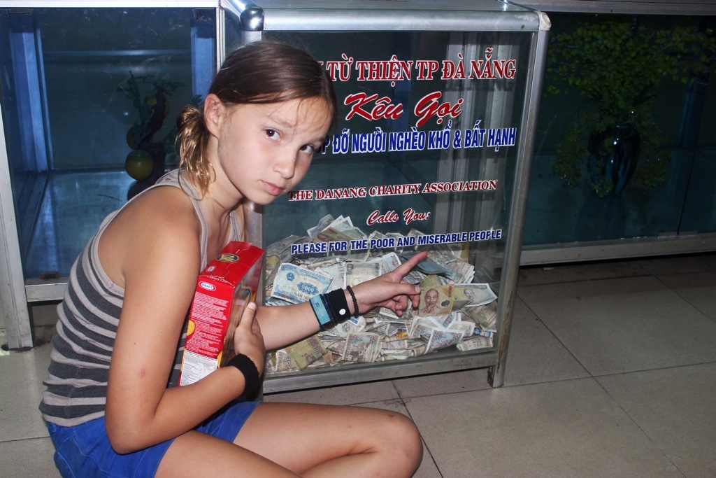 It had been a long day by the time we spotted this sign. I don’t know if it didn’t translate well- but asking for money for miserable people made me start laughing uncontrollably. I had Em pose by the sign then started laughing all over again because of how she was holding on so tightly to a box of Ritz crackers. We were so hungry when she saw the crackers at the train station market area. She was afraid someone might open the box before her and she wouldn’t get her “fair share” so she wouldn’t put the box down. Oh, what have we become? I’m taking pictures of donation boxes set up to help people and Emerson is holding on to a box of crackers as if her life depended on it.