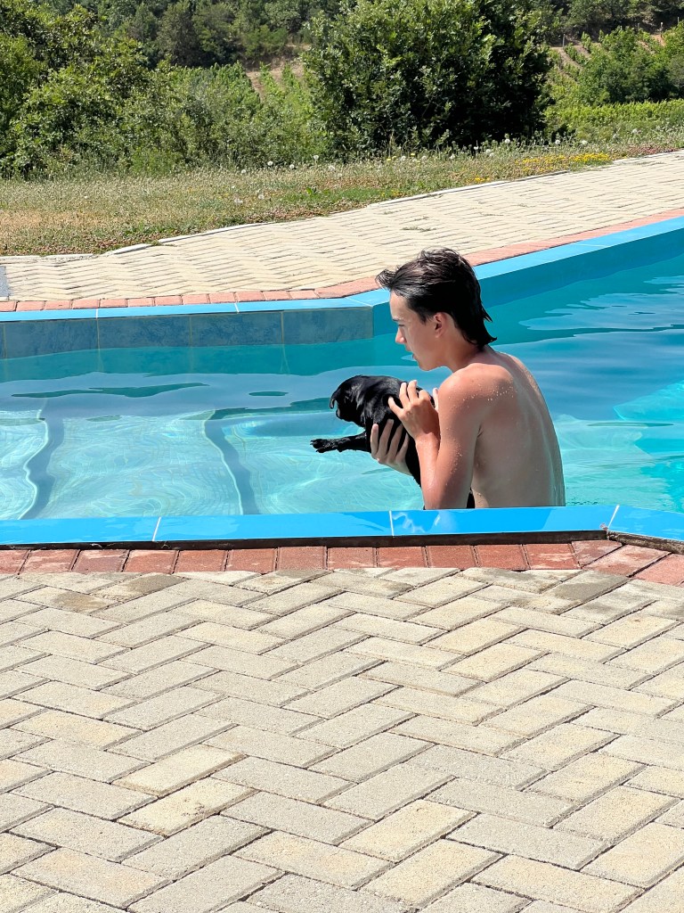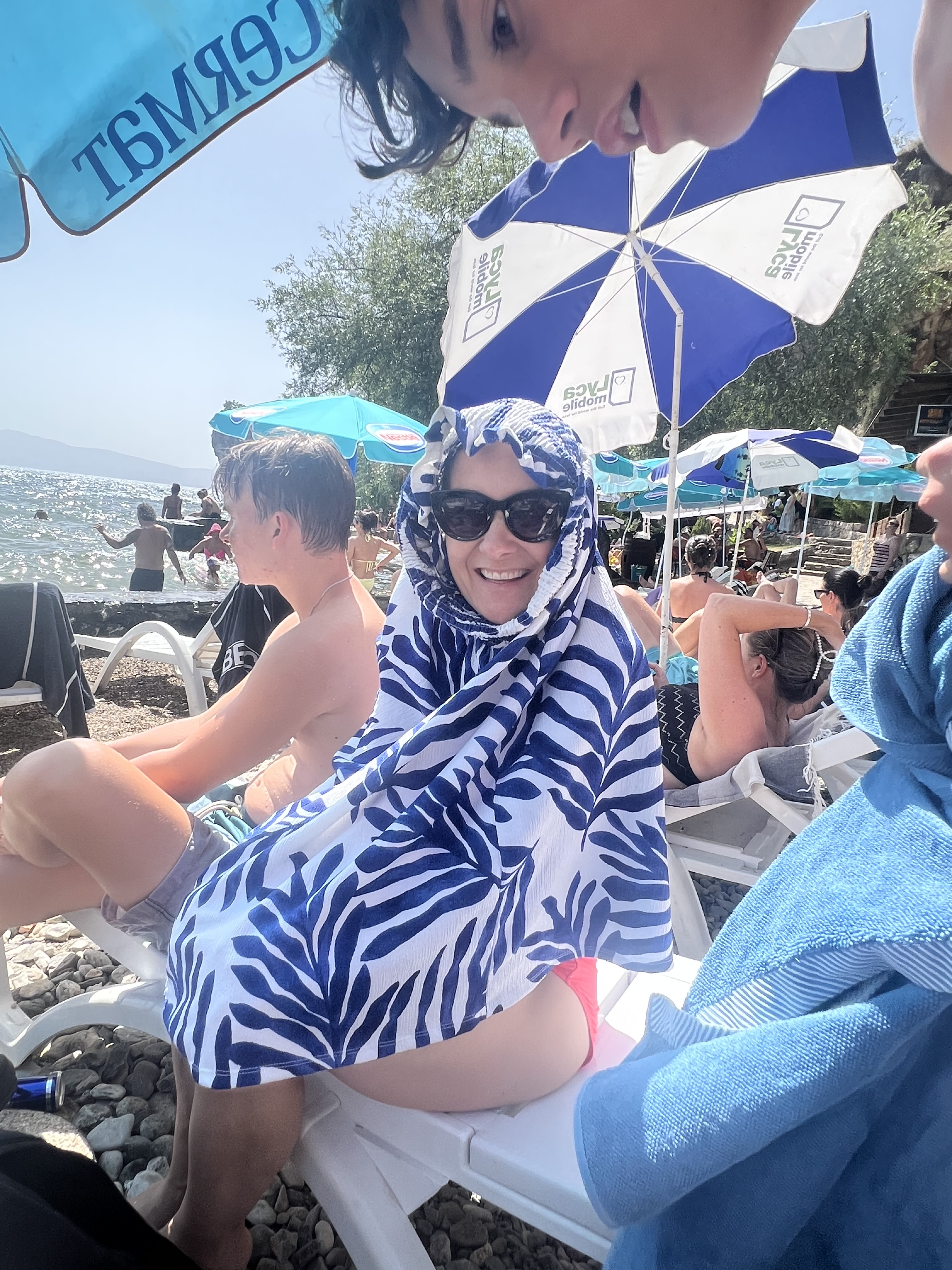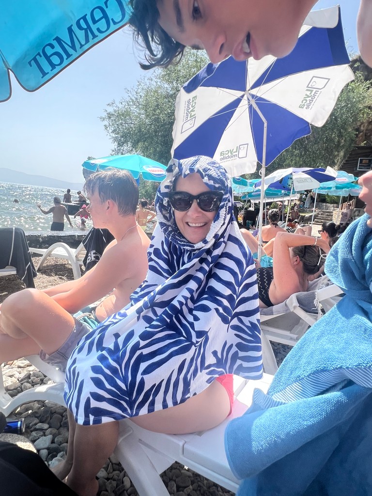 This was a fun day of swimming and getting caught in a rain storm. The photo of me wrapped in a tablecloth is from a restaurant where a waiter noticed I was cold. He draped it around me. So kind and resourceful. 🙂 We were stopped by police after I took the video of us driving into the city square. Whoops. All’s well, that ends well.